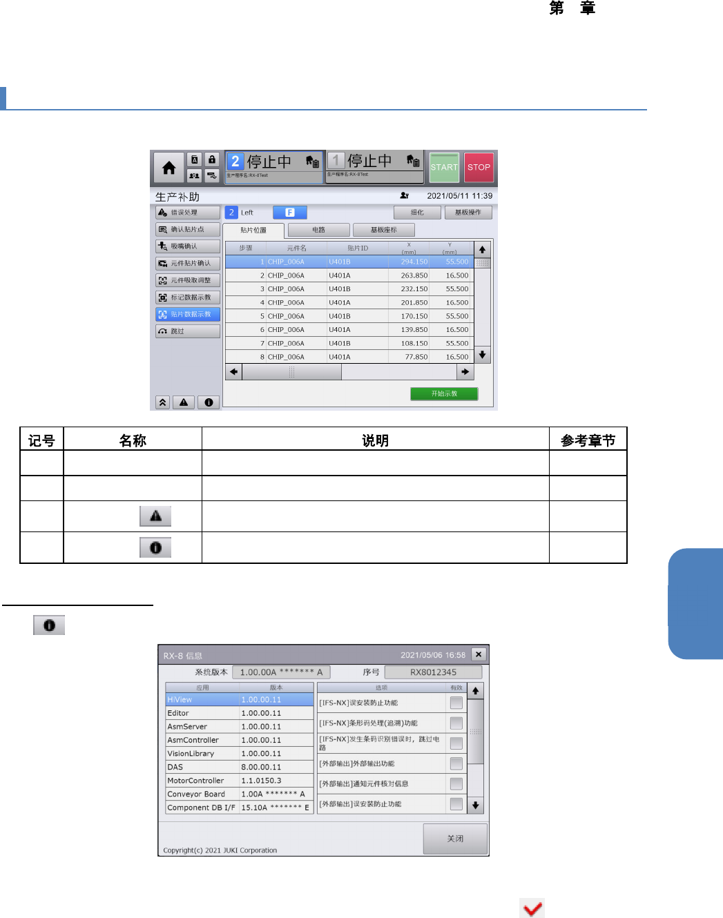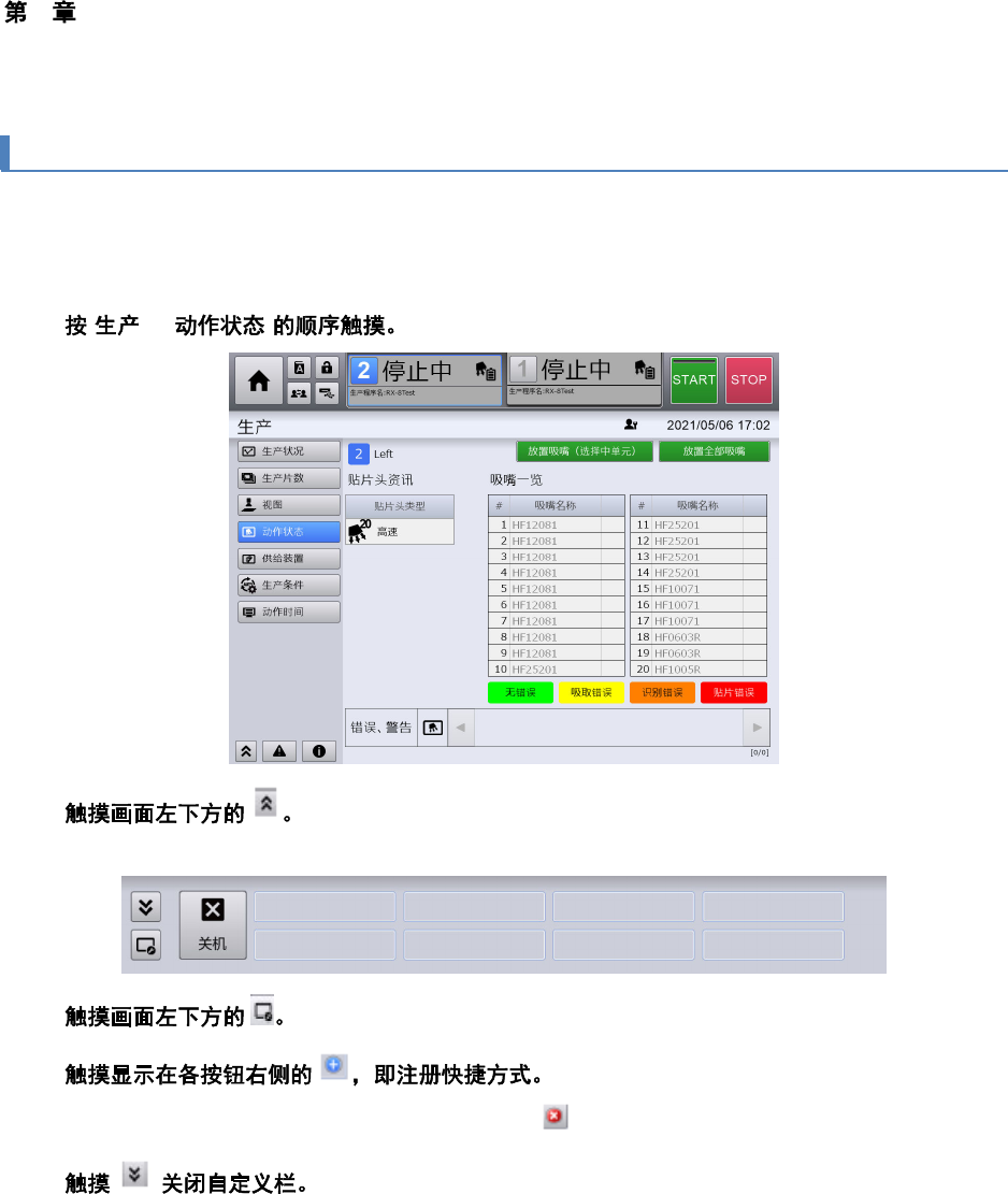 4 操作篇 4-2 操作画面构成 16 4-2-5. 自定义栏 显示 [ 关闭 ] 按钮,还有各用 户注册的子菜单按钮。触摸 显示的按钮,可显示该功能的画面(快捷 键功能)。 点击 [ 关闭 ] 按钮,关闭本机。 在此以 [ 生产 ] 的子菜单 [ 动作状态 ] 的注 册方法为例进行说明。 1 [ ] - [ ] 2 在画面下方显示自定义栏。 3 4 要从快捷方式按钮中删除功能时,触 摸按钮右侧的 。 5