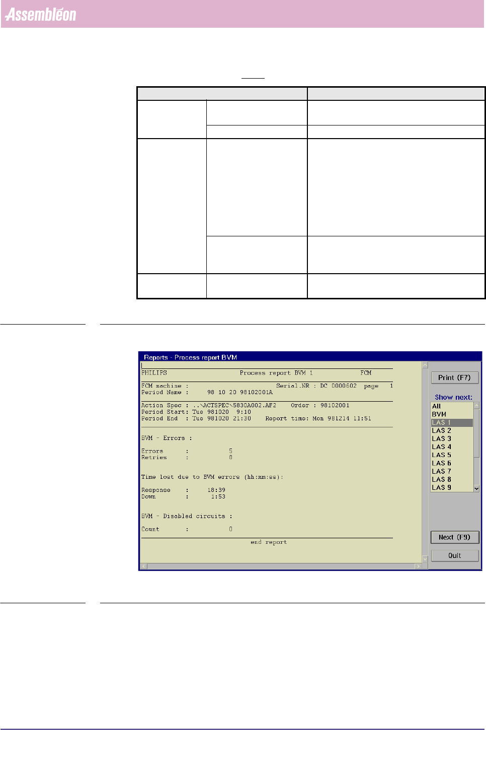 4022 591 96082 User Re ference Manual 02.02 FCM Multiflex 5-25 MIS Report text expl anation, BI opti on T ABLE 5- 11 fcm05 26a.tif SCREE N 5-1 9 [Proc ess r eport... ] , BI screen e xample Report text Explanation BI - E …