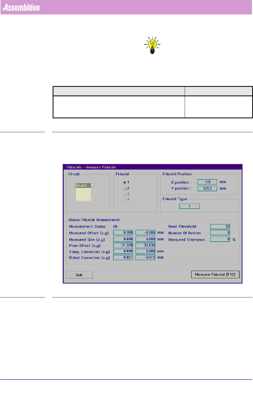 The system will try to measure the selected fiducial; the result will be displayed in