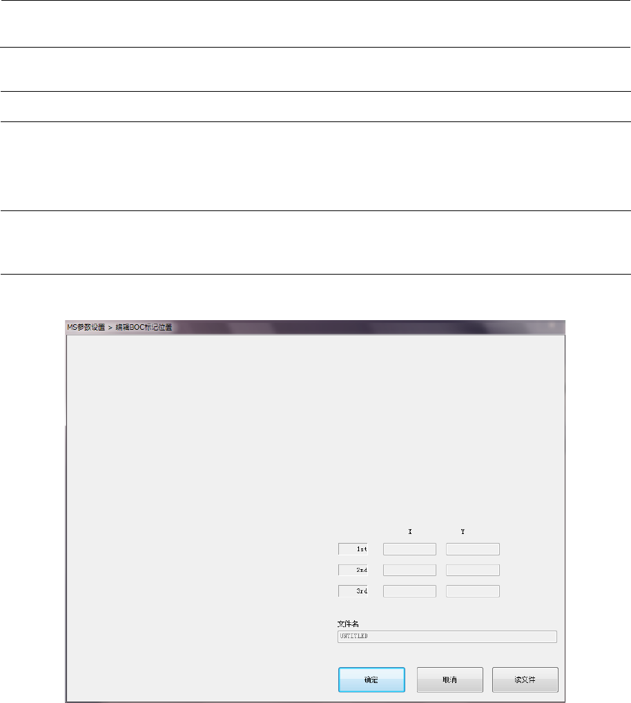 MS 参数 8-9 8-6 编辑 BOC 标记位置 8-6-1 功能 希望正确输入 BOC 标记位置(至 小数点后 4 位)时使用。 该项目仅在工厂 初始出货 时进行调整,故 请勿变更。 8-6-2 使用模具 本项目中不使用 模具。 8-6-3 操作 从菜单中选择“ 贴片参数 ”-“编辑 BOC 标记 位置”后 ,会显示以下 的对话框 。 如按“读文件” 按钮,会 显示打开文件的 对话框,在此选 择 BOC 标记文件。 打开文件后,调 …