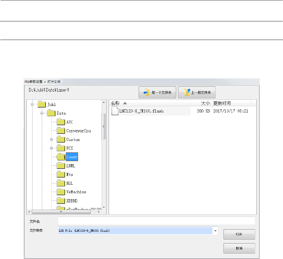 MS 参数 9-2 9-1-1-1 激光 按“执行”按钮 ,打开用 于进行版本升级 的对话框。 (默认位置 : D: \ JUKI \ D ATA \ Laser )选 择文件( LN C120 - 8_JM 5 0.flash ) ,按“打开”按钮 读入 文件,对所有全 LNC120 的固件进行版 本升级。