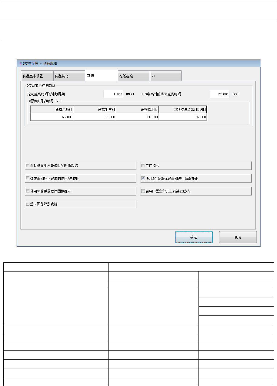 MS 参数 3- 11 3-4-1-2 传送其他 点击选项卡“传 送其他” 后,会显示以下 的对话框。 项目 选择的内容 备注 输出准备完毕的 关闭时间 入口传感器 OFF → ON 默认 入口传感器 ON → OFF 入口传感器 ON → OFF →时间 定时器时间设置 (单位 ms ) 从入口到中间 的移动时间 搬出基板时关闭 C.O UT 传感器 搬出基板时打开 OUT 传 感器 搬出基板时打开 C.O UT 传感器 默认 开始搬…