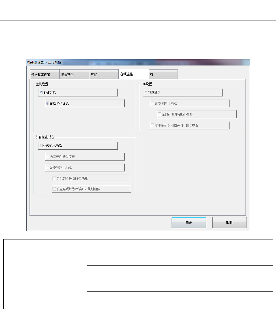 MS 参数 3- 13 3-4-1-4 在线连接 点击选项卡 “ 在线连接”后,会显 示以下的 对话框。 项目 选择的内容 主机 设置 传播坏点标记 IFS 设置 误安装防止功能 条形码处理(追 溯)功能 发生条码识别错 误时,跳 过电 路 外部输出设定 通知元件核对信 息 误安装防止功能 条形码处理(追 溯)功能 发生条码识别错 误时,跳 过电 路