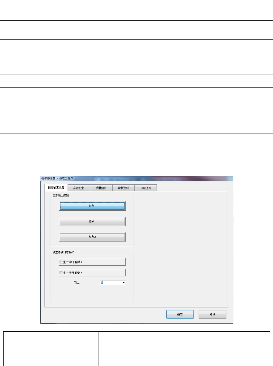 MS 参数 3- 15 3-5 特订 根据需要进行设 置。通常 情况下不需要设 置。 3-6 服务人员 3-6-1 功能 设置修理工序师 要用的、 与各种生产等动 作或日志相关的 规格。 本项目分为 “日志 输出设置” 、 “实时检查” 、 “质量 预防” 、 “带状送料” 和 “吸取送料” , 可利用 选项卡进行切换 。 3-6-2 操作 从菜单中选择“ 初始设置 ” - “服务人员” 后,会显示如下 的对话框。 3-6-2-1 日志…