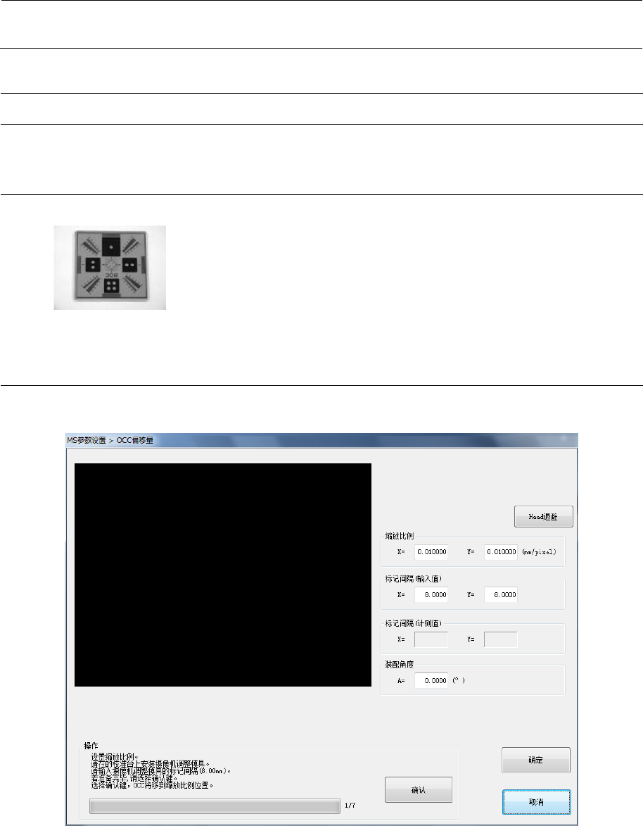 MS 参数 4-6 在校准台上铺上白纸,再在上面放置相机调整模具。此时,请使相机调整模 具的中心与校准台 的中心基本对齐 。 相机调整模有表 面和背面 ,将蒸镀面 ( 可以 清晰看到图形的 面 ) 朝下放置。 另外,请使 “ BOC ”文字在 XY 坐标系 Y 轴的 负值侧。 在标记间隔 ( 输入值 ) 中,输 入相机调整基板 X 与 Y 方向 的标记间的距离 ( 3mm )。 <操作 ・ 1/7 > 按下“确认”按 钮,将 OCC 移…