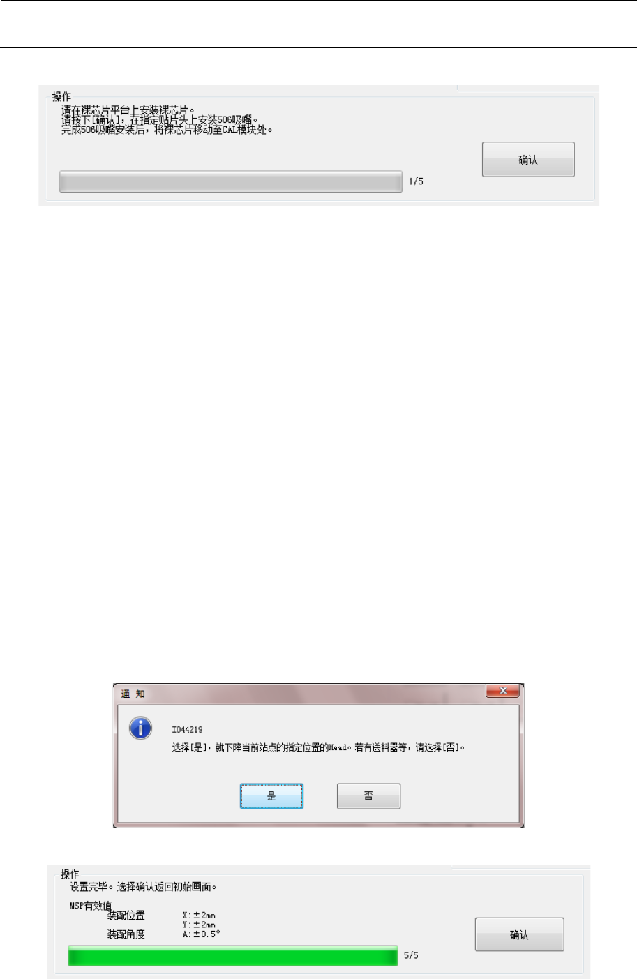 MS 参数 5-8 <操作 ・ 1/ 5 > 要调整的 Head 吸嘴选择好以后, 请将裸芯片设 置在裸芯片平台 上。 并且, 在被设定的 H ead 上安 装 506 号吸嘴, 准备完毕后点击 “确认” 。 选择 “确认” 后, 由 指定 Head 号低的 H ead 将裸芯片从裸芯片 平台移动 到裸芯片平台。 • 计测内容 ① 使 He ad 角度为 0 度。 ② 启动 Hea d 的真空 以吸取裸芯片 ,使之 向校准块移动 。 ③…