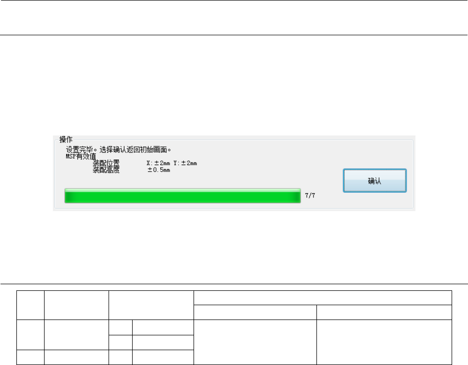 MS 参数 5- 12 • 计测内容 ① 分别计测 校准台上的 9 处高度。 ② 在取得的 9 处高度中,去除最高 2 处 、最低 2 处, 将剩余的 5 处之平均值作为装 配高度,并进行 更新。 <操作 ・ 7/7 > 所有的计测结束 后,会显 示以下的对话框 。 按下“确认”后 ,返回初 始设置画面。 5-4-4 MSP 容许值 No. 项目 MSP 容许值 MSP 值不良时 出现的问题 调整(检测)项 目 1 装配位置 X ± 2…