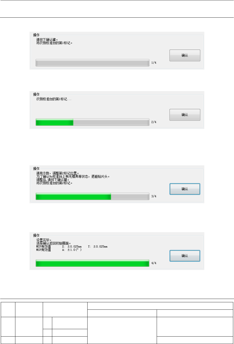 MS 参数 7-4 <操作 ・ 1/4 > 请确认校准台上 没有模具 ,按下确认按钮 。 <操作 ・ 2/4 > 进行第 1 标记识别,如果未发 生识别 错误,则移动 到第 2 标记的位 置。 以 OCC 识别校准台的第 1 标记, 显示取得的坐 标。 再向校准台的第 2 标记位置移动 ,进行识 别。 <操作 ・ 3/4 > 仅在第 1 标记、第 2 标记均发生识 别错误时 才会要求示教。 通过示教调整位 置,按下 确认按钮,则在 所示…