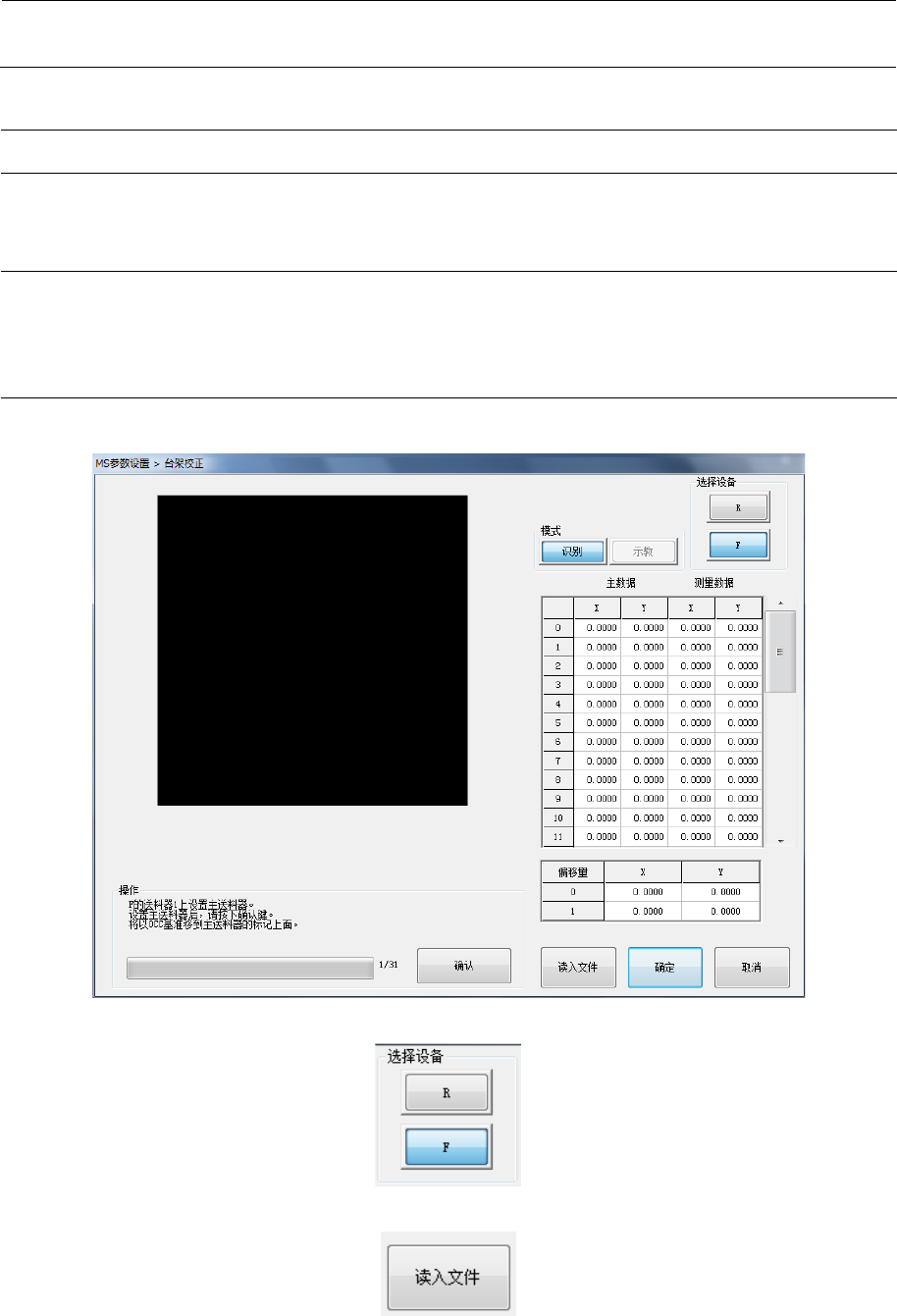 MS 参数 7- 13 7-7 台架补正 7-7-1 功能 在出库前,为了 对应台架 弯曲状态对台架 标记的识别位置 进行补正,测 定台架的弯 曲状态。 7-7-2 使用模具 ・ 主台架 ・ 主供料器 7-7-3 操作 从菜单中选择“ 单元参数 ”-“台架补正 ”后,会显示以 下对话框。 从选择设备中, 选择要设 定的单元。 选择设备后,按 下“读入 文件”按钮开始 读入主台架数据 。