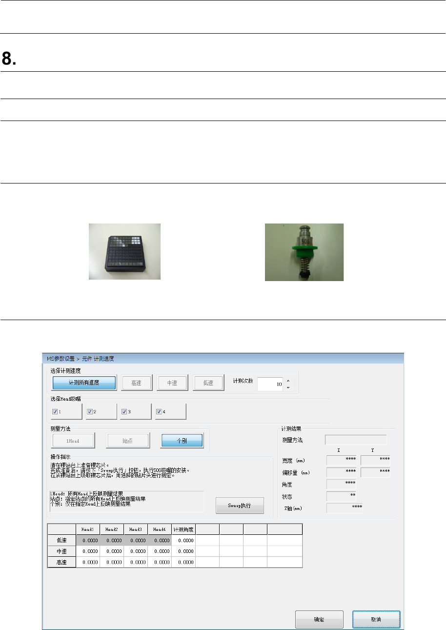 MS 参数 8-1 贴片参数 8-1 元件计测速度 8-1-1 功能 当 LNC120 的旋转速度不 一样时,对发 生的角度偏移 进行校正。 将激光测量中产 生的对低 速的偏离量作为 偏移量算出。 8-1-2 使用模具 • 3.7 DUM MY W AF ER ( 40035043 ) ( 裸芯片 ) • 506 吸嘴( 40001344 ) 8-1-3 操作 从菜单中选择“ 贴片参数 ”-“元件计测 速度”后,会显 示如下对话框 。