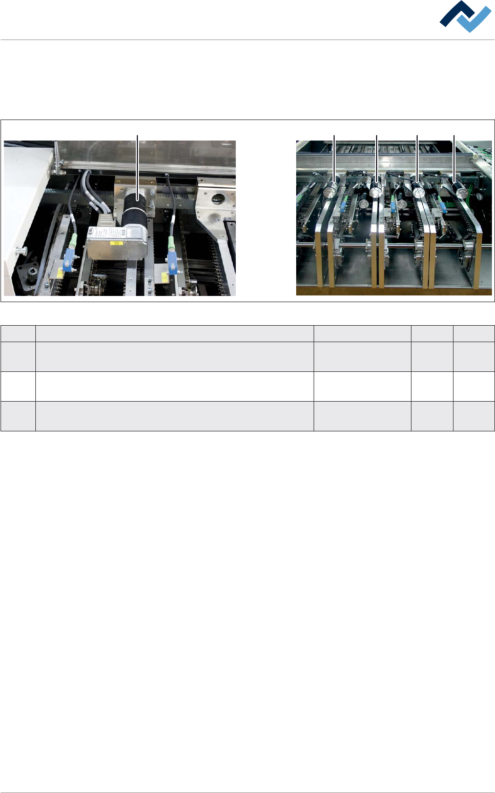 4 1/2 1/2 3 Fig. 226: Catene motore Pos. Denominazione Numero articolo A B 1 Catena di azionamento, merce a metraggio 6KE06B-1G67N x 2 Lucchetto della catena 6KES06B-1G67N x 3 Molla 6FEDZ-094I x 4 Rullo di rinvio da Ø 35…