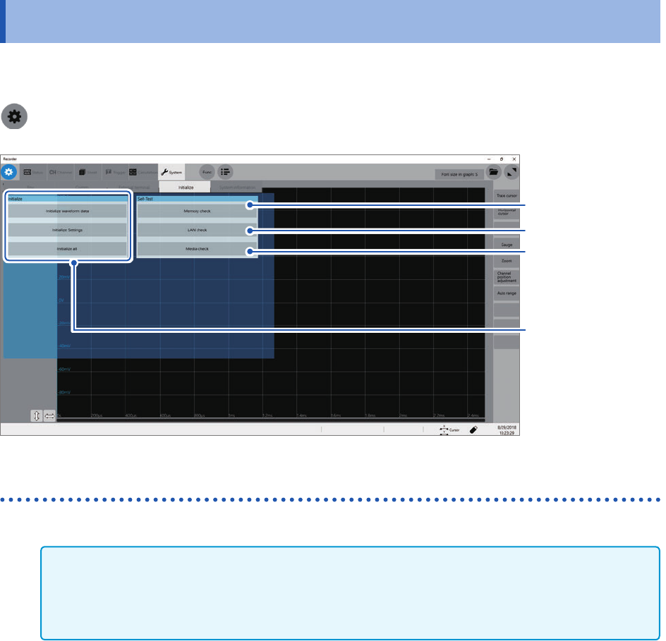 154 Self-check 6.4 Self-check Executing the self-check function checks the instrument for malfunctions. The self-check consists of the following checks: > [System] > [Initialize] (p. 155) (p. 154) (p. 157) “Initial…