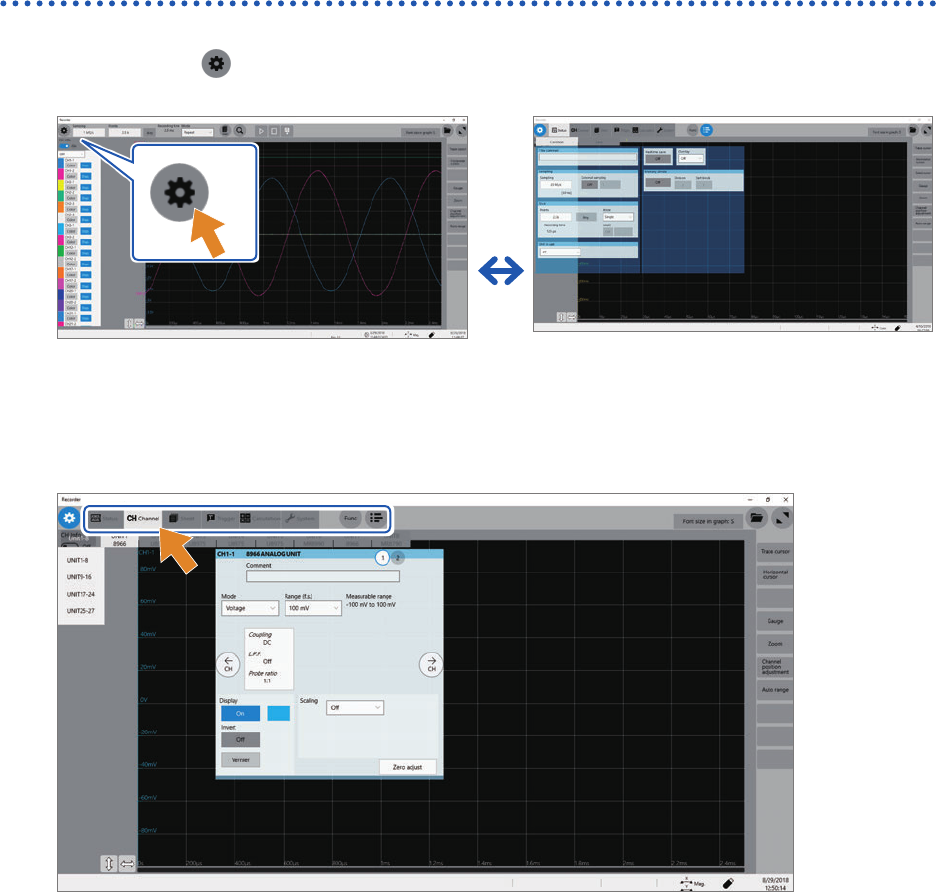 Switching between the waveform and setting screens