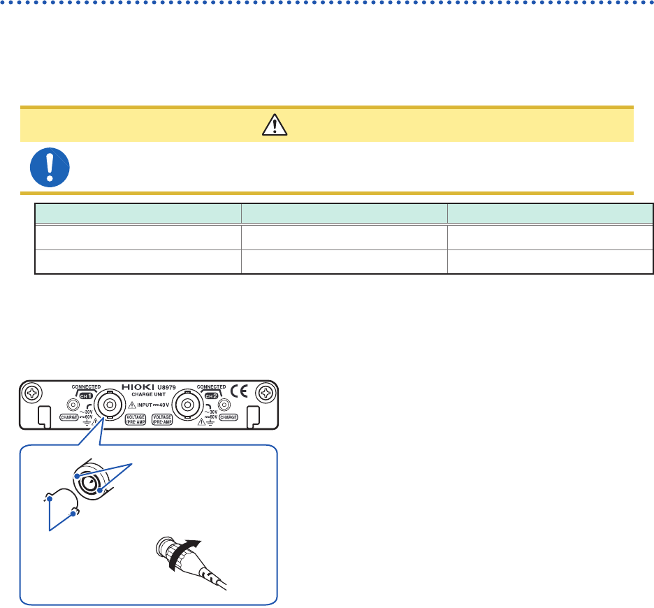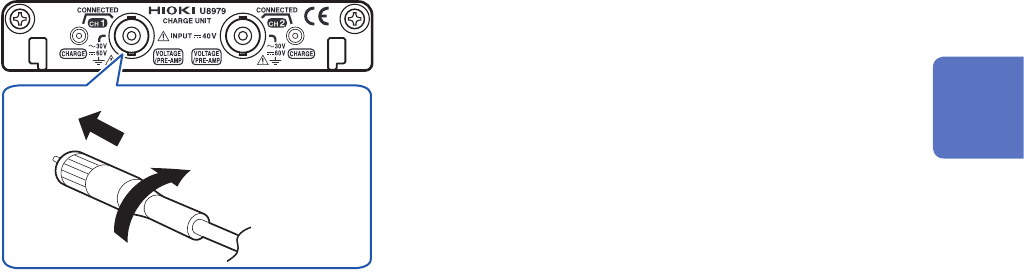 47 Attaching Connection Cords Connecting a charge-output acceleration sensor Connecting a charge-output acceleration sensor equipped with the miniature connector (#10-32) Model U8979 Charge Unit T ighten the screw . 1 Al…