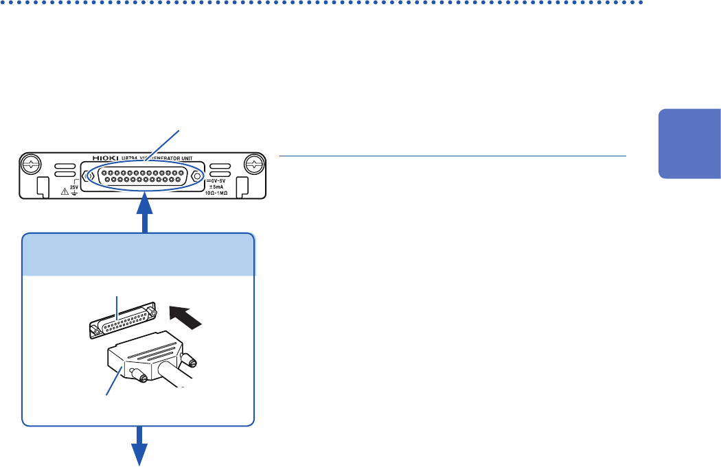 51 Attaching Connection Cords Outputting voltage, current, and resistance Attach the connection cable to Model U8794 VIR Generator Unit . Required item: commercially available cable (D-sub 25 pins) How to connect the cab…