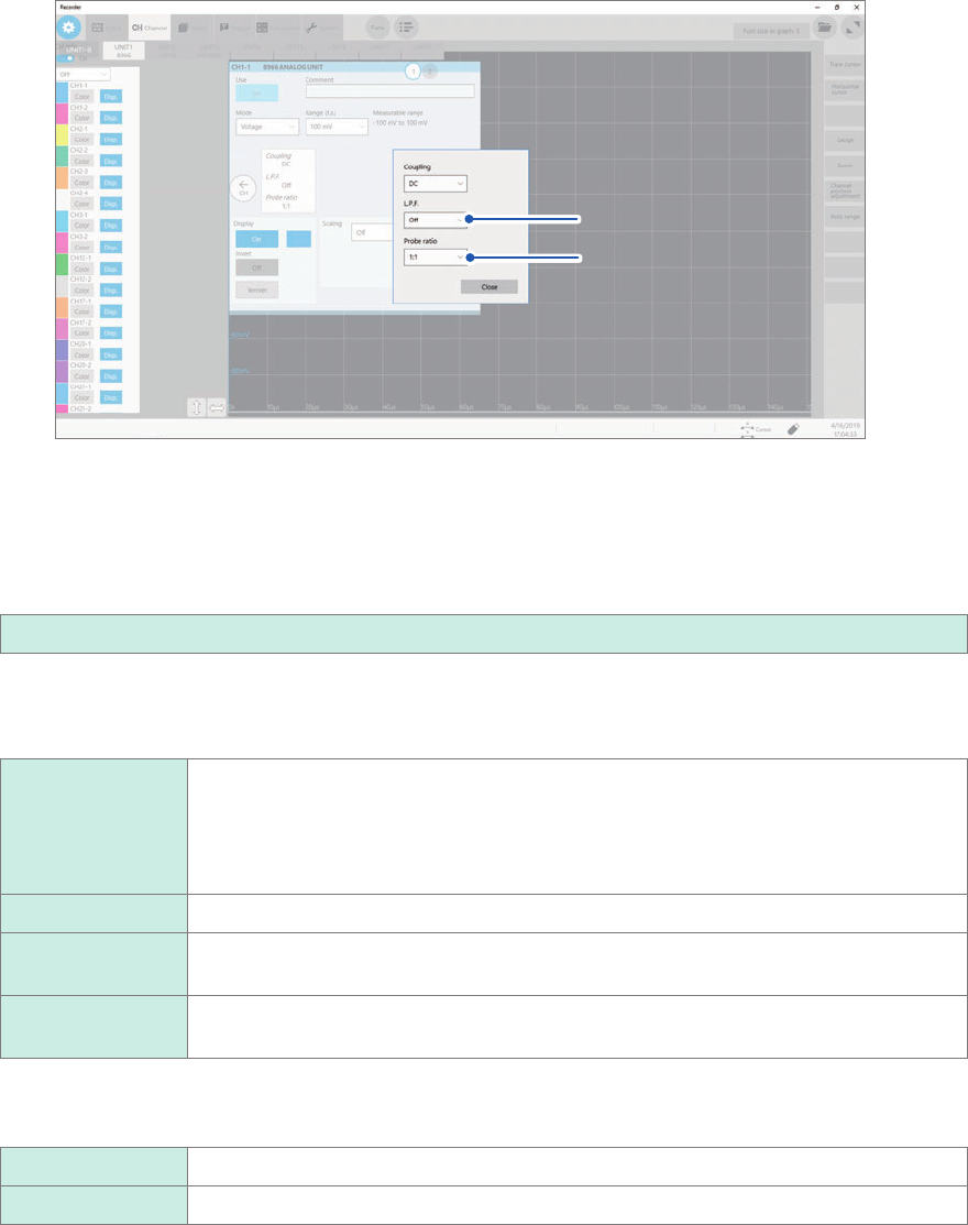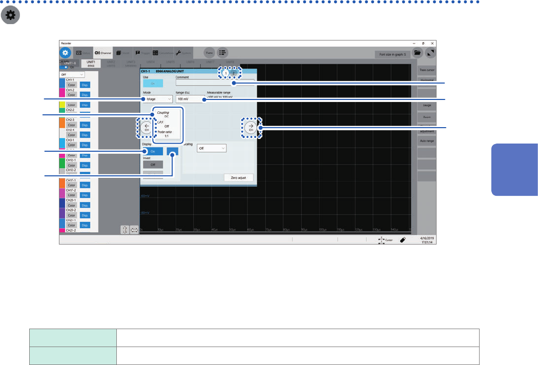 71 Conguring the Input Channel settings Analog channel > [Channel] > [UNIT] 2 5 4 1 3 6 7 1 Enter a comment in the [Comment] box. Number of characters that can be entered: up to 40 2 Click the [Mode] box, and then…