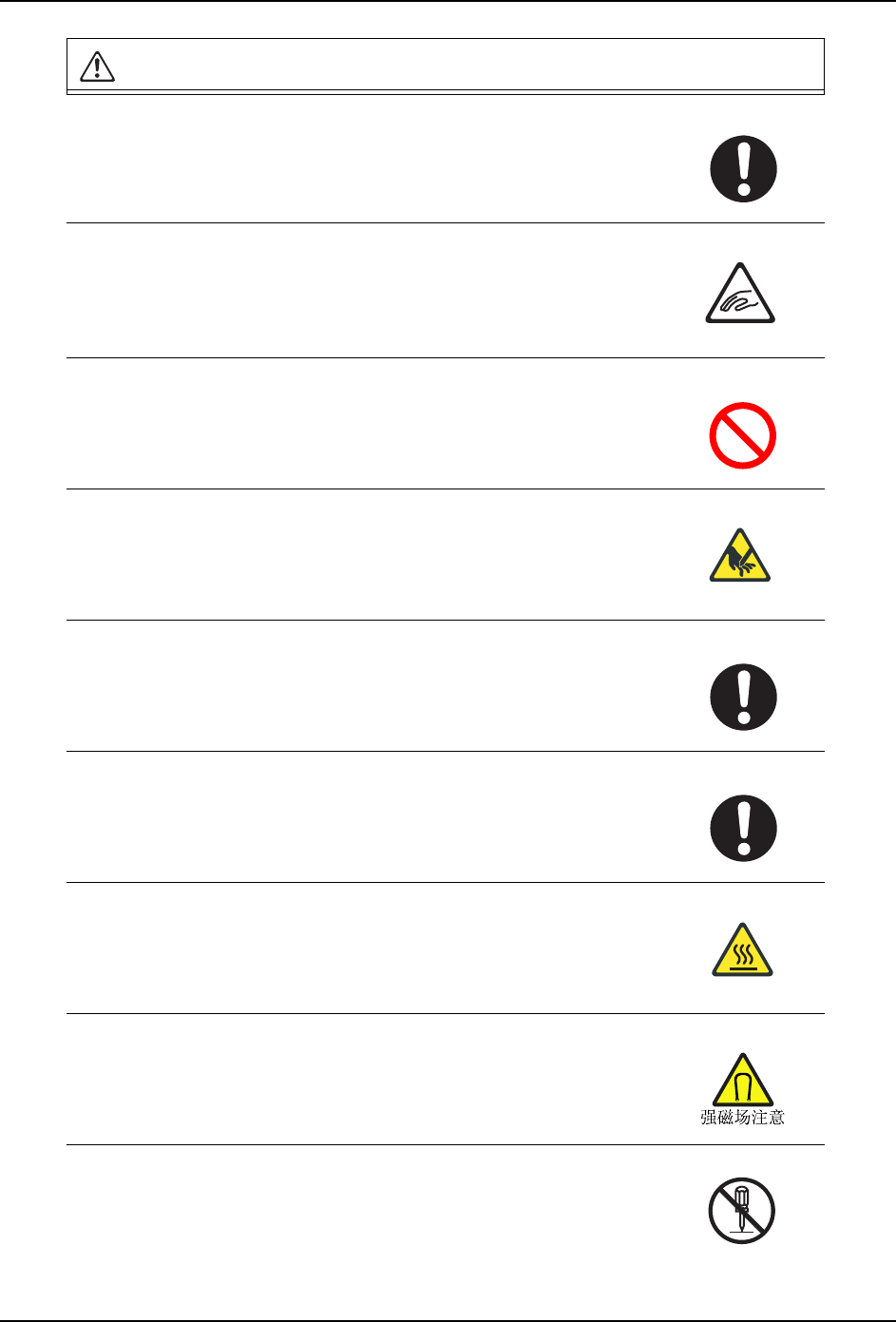 1. 安全指南 QD111-04 6 供料器类型清扫刷单元使用说明书 在废料带箱上方的基座开口部位 进行作业时,请注意不要让其他的 作 业人员拉出模组。 · 手指有可能被拉出的模组和基座 挤压而受伤。 当卸下基座上的防护罩、在开口 部位进行作业时,请注意不要让其 他 的作业人员拉出 / 插入模组。 · 有可能被拉出 / 插入的模组夹住并切断手指。 当模组在 MCU 上时,绝对禁止将模组锁定旋钮设 定在 「UNLOCK」位 置上。 · 有…