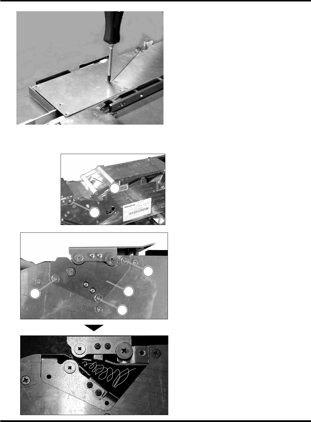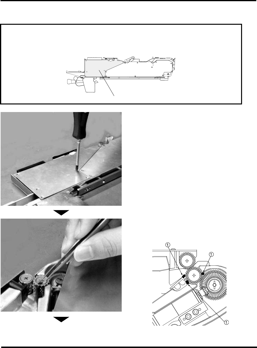 I ntelligent T ape Feeder 操作手册 7.1 关于故障 Page 7-9 3. 拧紧螺丝按上外壳。 ∗ 拧紧扭矩标准为 40 N• cm 。 除去咬住在引导部的压紧胶带 (88 m m 、 104 m m 编带供料器 ) 压紧胶带 咬住在导滚齿轮部 上时,请打开盖后除去编带。 1. 放松固定螺钉 (3 处 ) 后卸下引导盖 。 2. 用小钳子或尖嘴钳除去堵塞的压紧胶带 屑。 3. 用螺丝再固定…