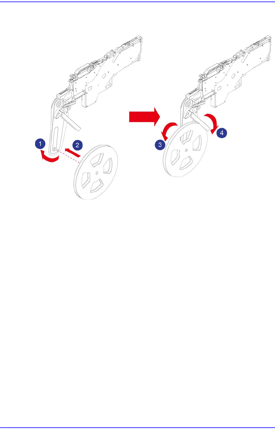 1) 往箭头方向牵拉直到带式供料器的卷轴臂板被固定为止。