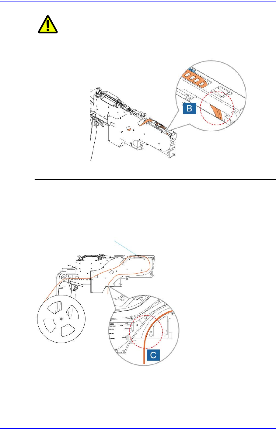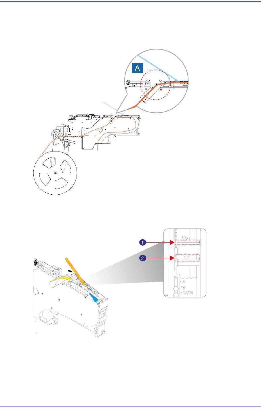 2-11 喂料器的操作 2.2.3. 卷带的安装及排出 如下图所示地让料带通过 “A” 。 图 2.13 卷带的安装方法 塑料料带从料带导件的前方 / 后方缝隙中的一个缝隙排放。 图 2.14 喂料器上盖卷带的设置 ( 通过方 / 前方间隙 (Slit) 安装料带 )