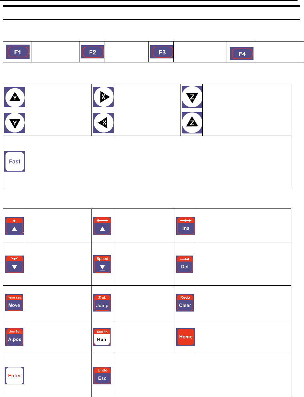 Accelerates jog speed – used with X+, X-. Y+, Y-, Z Up, Z Down