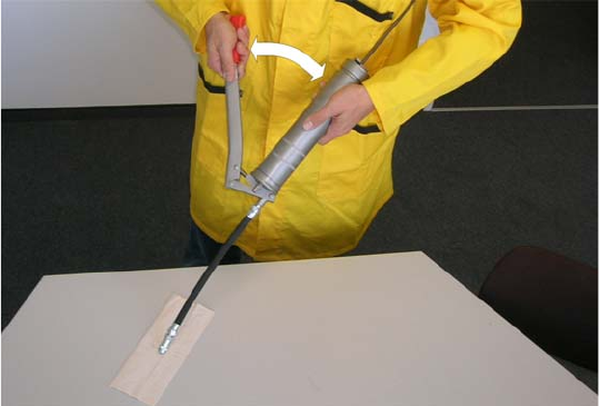 – To fill the rubber tank hose with grease, pump the lever until grease appears at the end of the