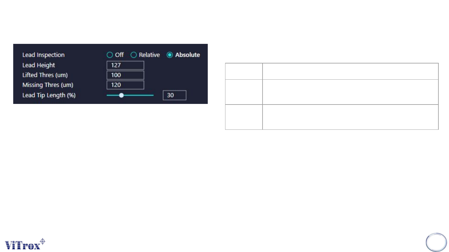 Copyright © ViT rox All Rights Reserved . S-T ype Algorithm - Joint Inspection 1 16 3. Lifted Thres (um) & Missing Thres (um) Reference Lead Height Lead Height - Missing Lead Thres Lead Height + Lifted Lead Thres Pas…