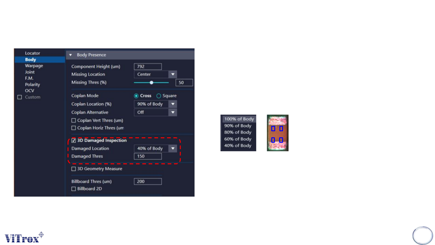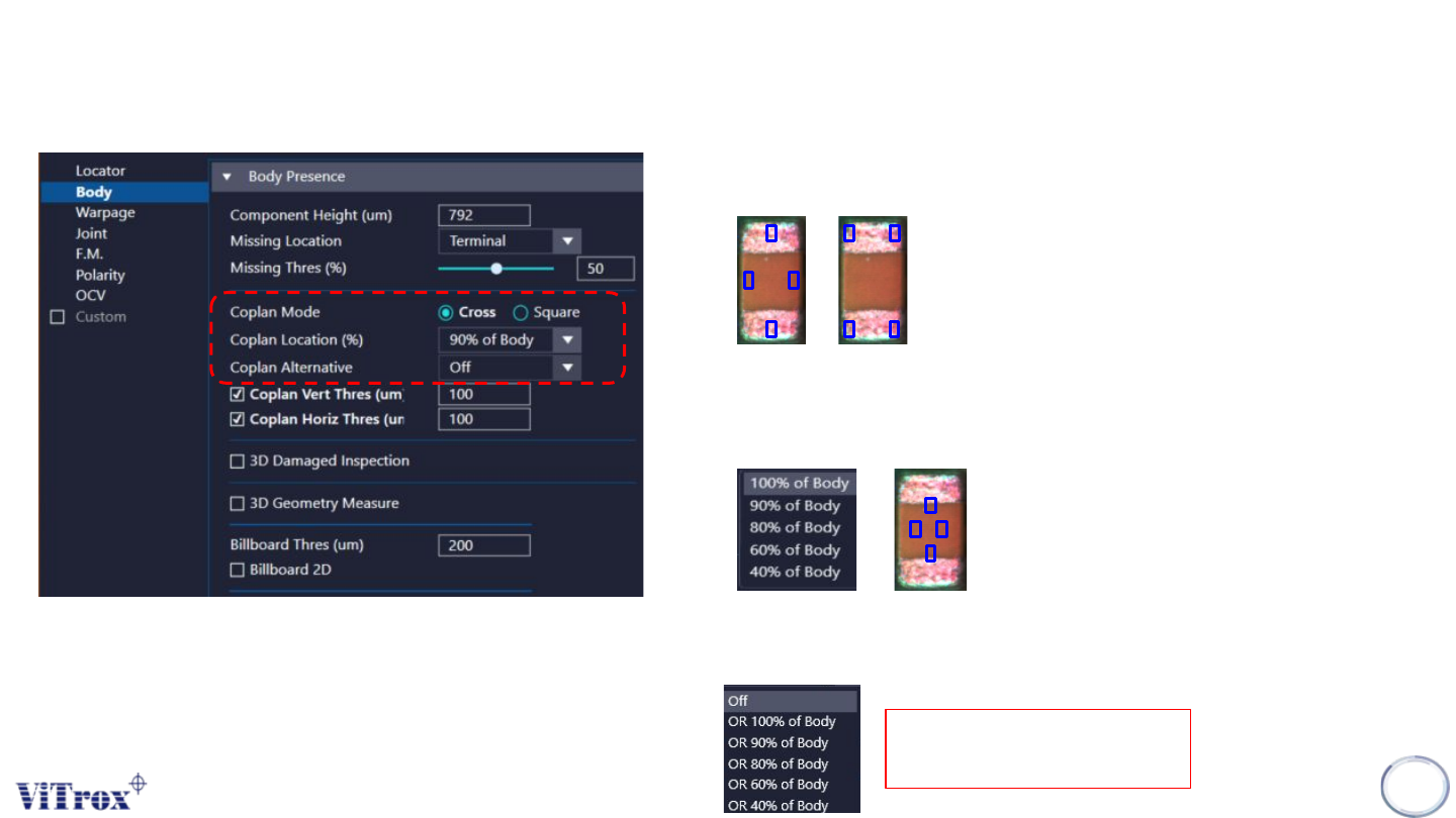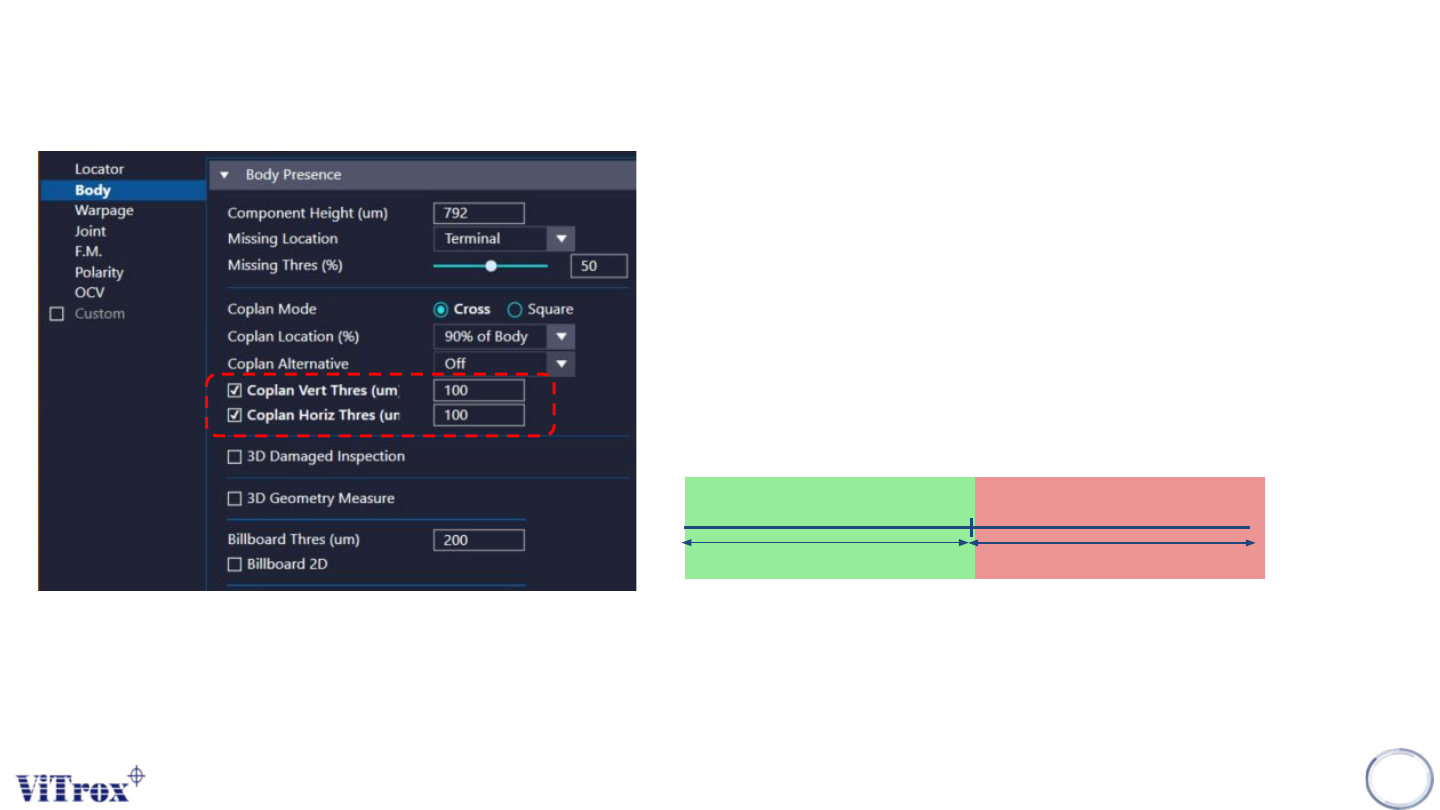 Copyright © ViT rox All Rights Reserved . CR T ype Algorithm - Body 14 1. Coplan V ert Thres (um) ● T ick this to enable the vertical direction for coplan inspection. ● Inspection result will prompt out Coplan if the abs…