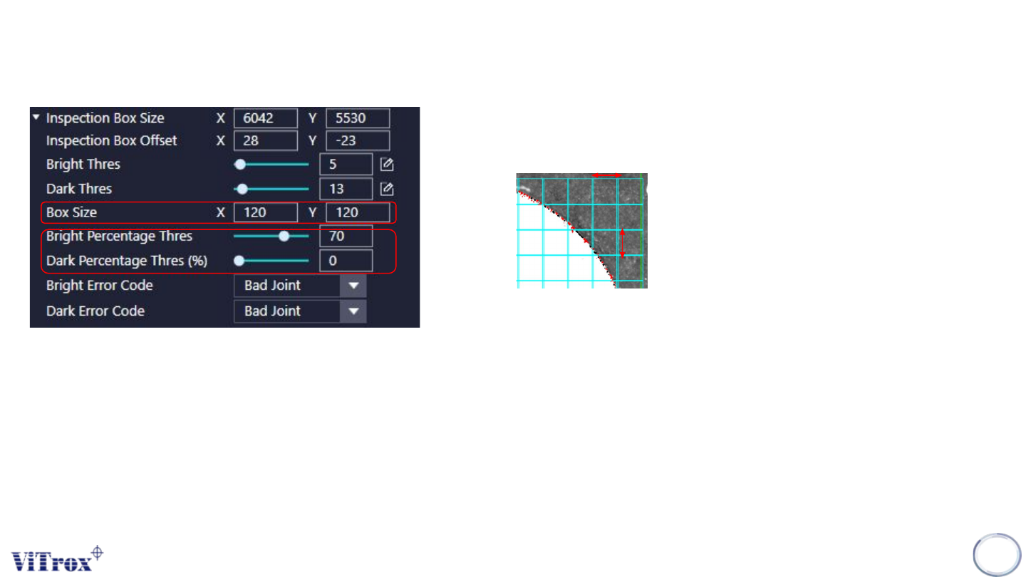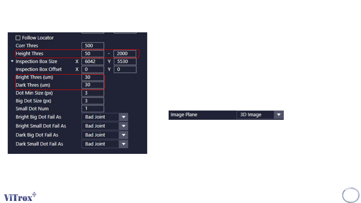 Copyright © ViT rox All Rights Reserved . U-type Joint- Diff Joint 182 Mode: Inspect 3D 1. Height Thres ● Adjust the height range to be defined as defects. 2. Bright Thres & Dark Thres ● Unit: um ● Bright - Higher ● …
