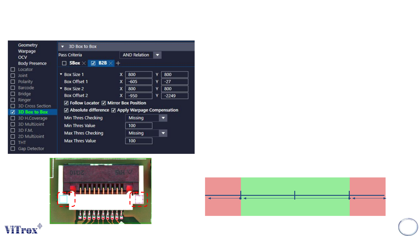 Copyright © ViT rox All Rights Reserved . U-type Locator - 3D Box to Box 200 1. Box Size & Box Offset ● T o adjust the inspection box size & inspection box offset 2. Follow Locator ● Tick this to let the inspecti…