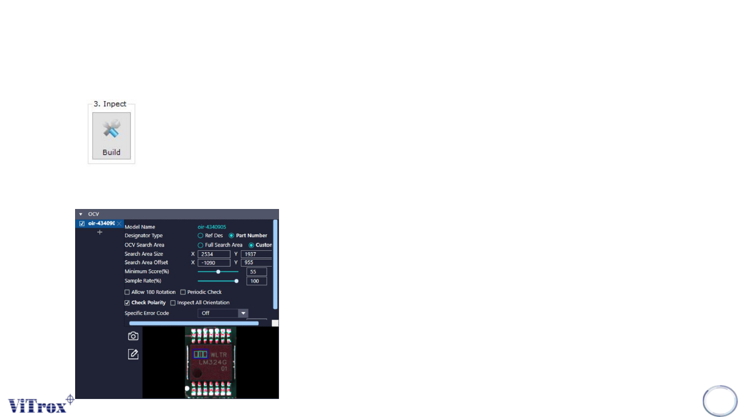 Copyright © ViT rox All Rights Reserved . OCV Inspection 275 1. Model Name ● Shows the model name for the OCV template. 2. Designator T ype ● Assign the OCV template by either Ref Des or Part number . 3. OCV Search Area …