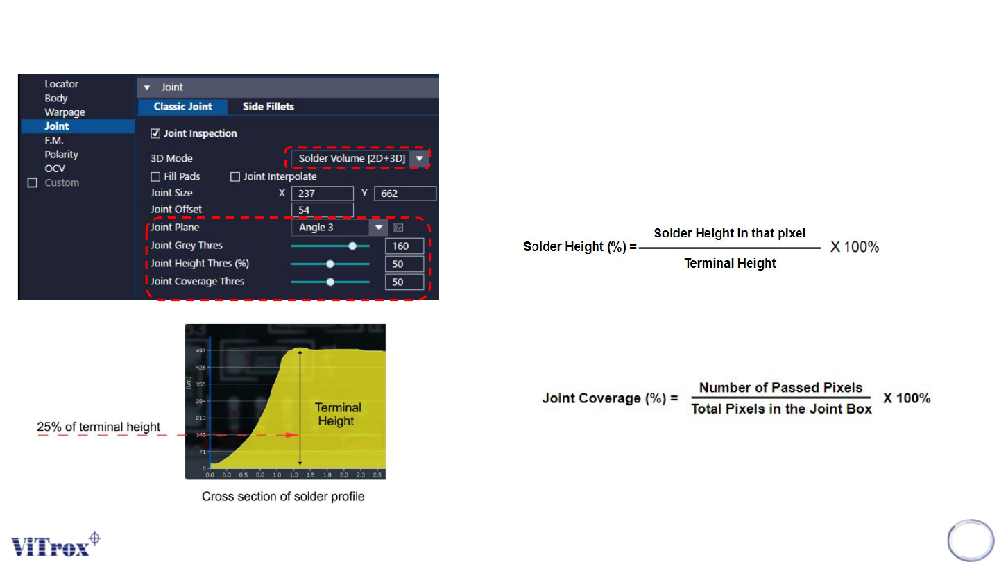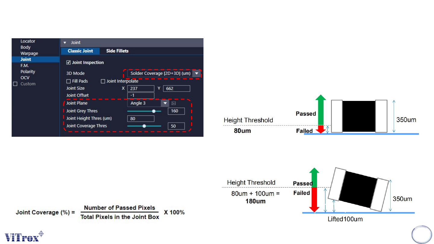 Copyright © ViT rox All Rights Reserved . 30 1. Solder Coverage 2D+3D (um) ● Same as Solder Coverage 2D+3D (%) ● Except the height unit in um. ● The height thres will increased when lifted body happened. ● Below shows 2 …