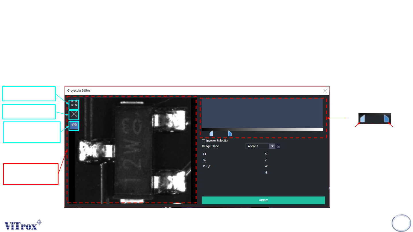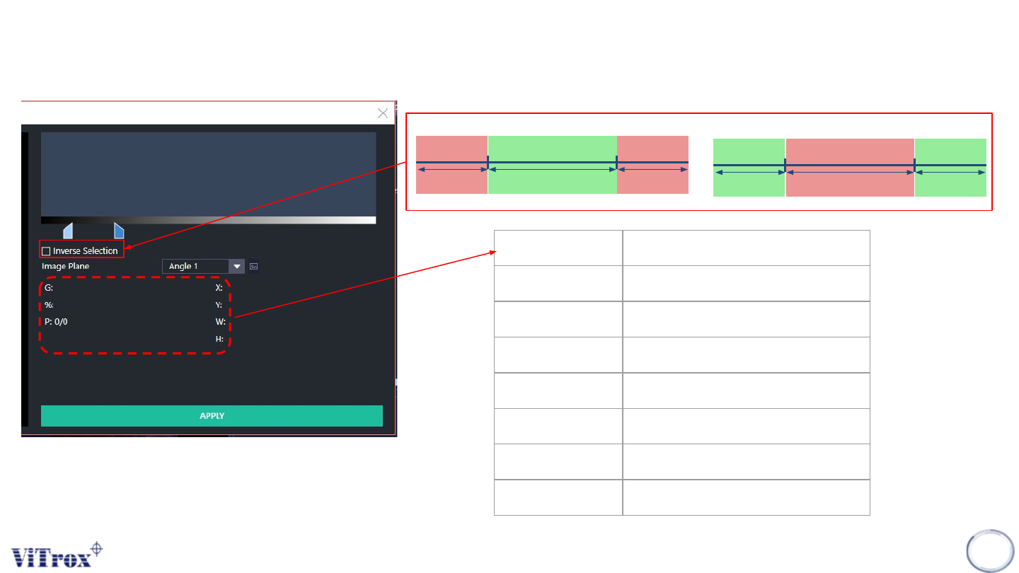 Copyright © ViT rox All Rights Reserved . GrayScale Editor 306 Parameter Description G Selected Grey Scale Range % Coverage (%) P Coverage (Area Cover / T otal Area) X X Location Y Y Location W Width of ROI H Length of R…