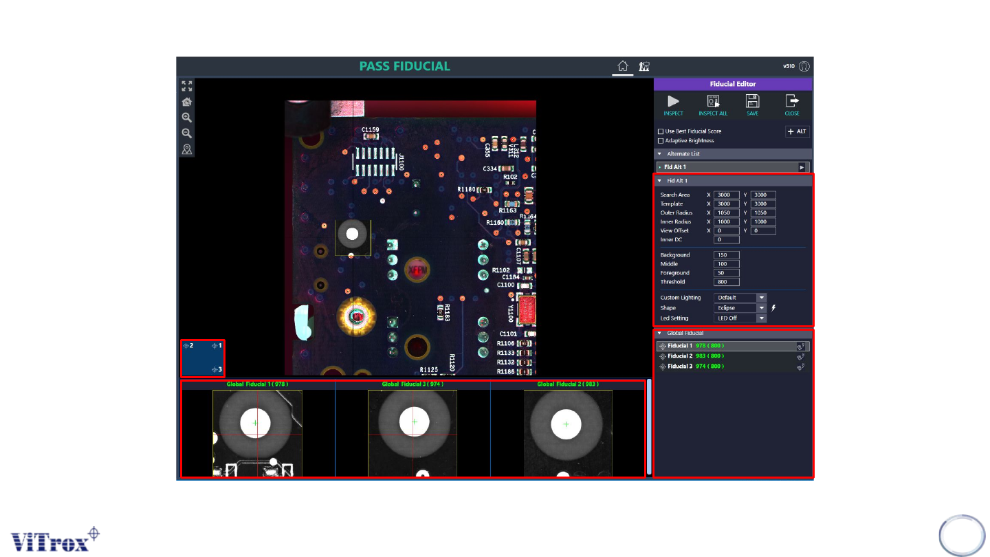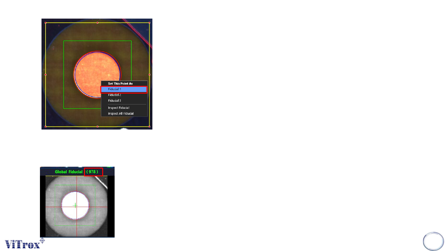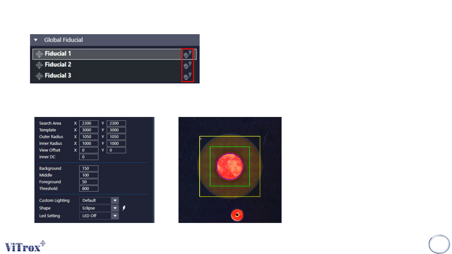 Copyright © ViT rox All Rights Reserved . 314 6. User may press the icons shows below to move the vision system to the estimated location of the fiducials. 7. Adjust for the fiducial parameters to ensure the shape, size …
