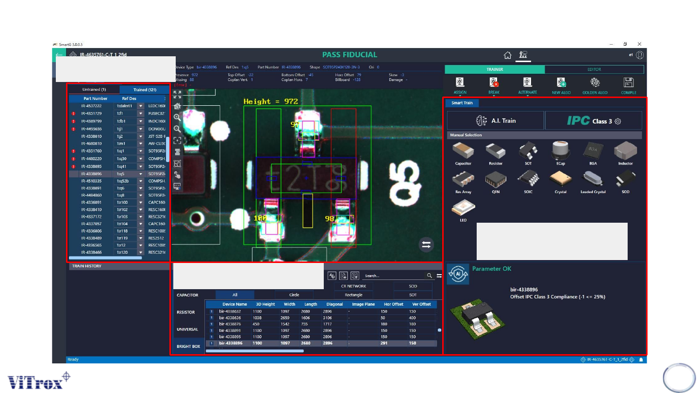 Copyright © ViT rox All Rights Reserved . 319 2. Below shows the T rainer Interface. T rained & Untrained List Golden algorithm selection list AI T rain Interface (Required AI License)