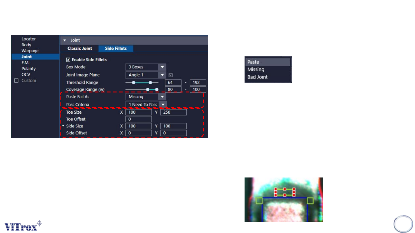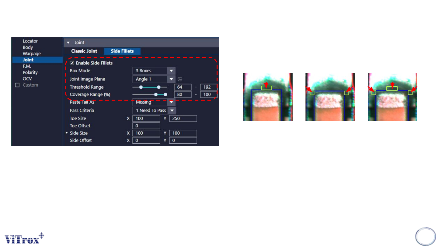 Copyright © ViT rox All Rights Reserved . 1. Enable Side Fillet ● T ick to enable side fillet inspection. ● By 2D only . (Grayscale) 2. Box Mode 3. Joint Image Plane ● Select the one that having best contrast among the J…
