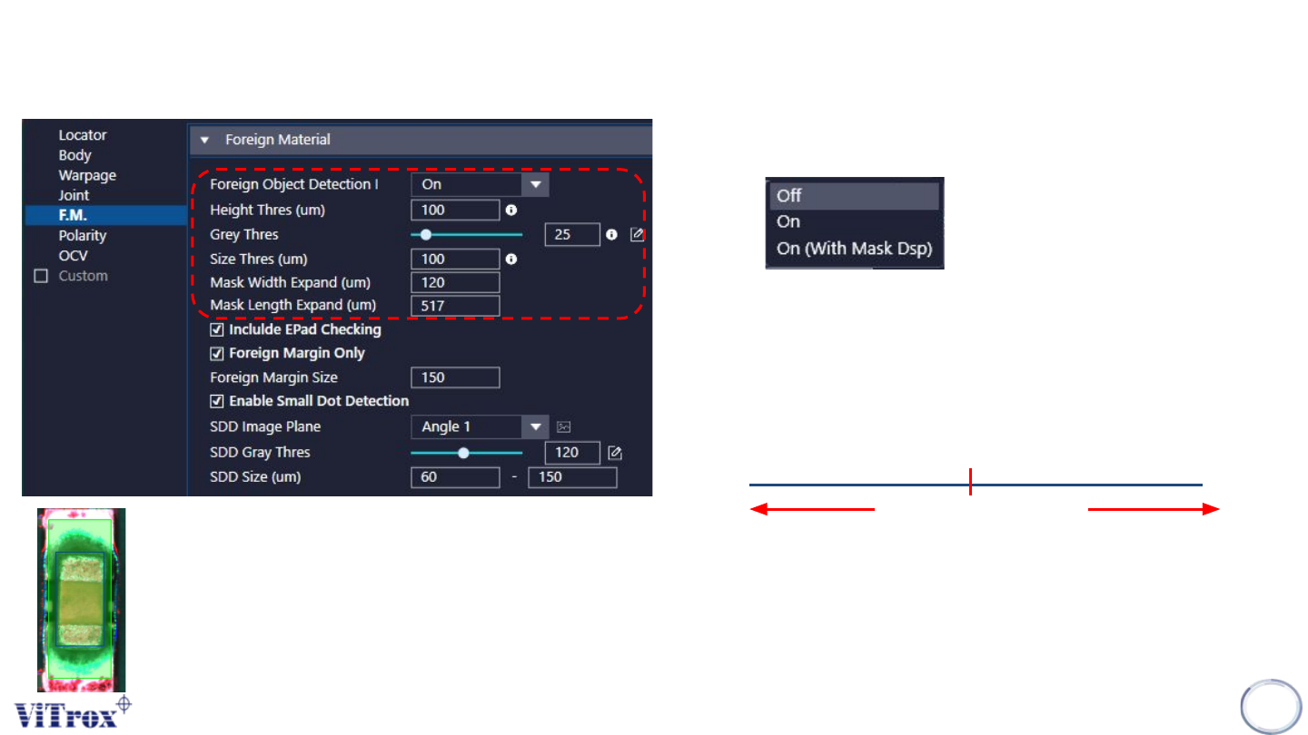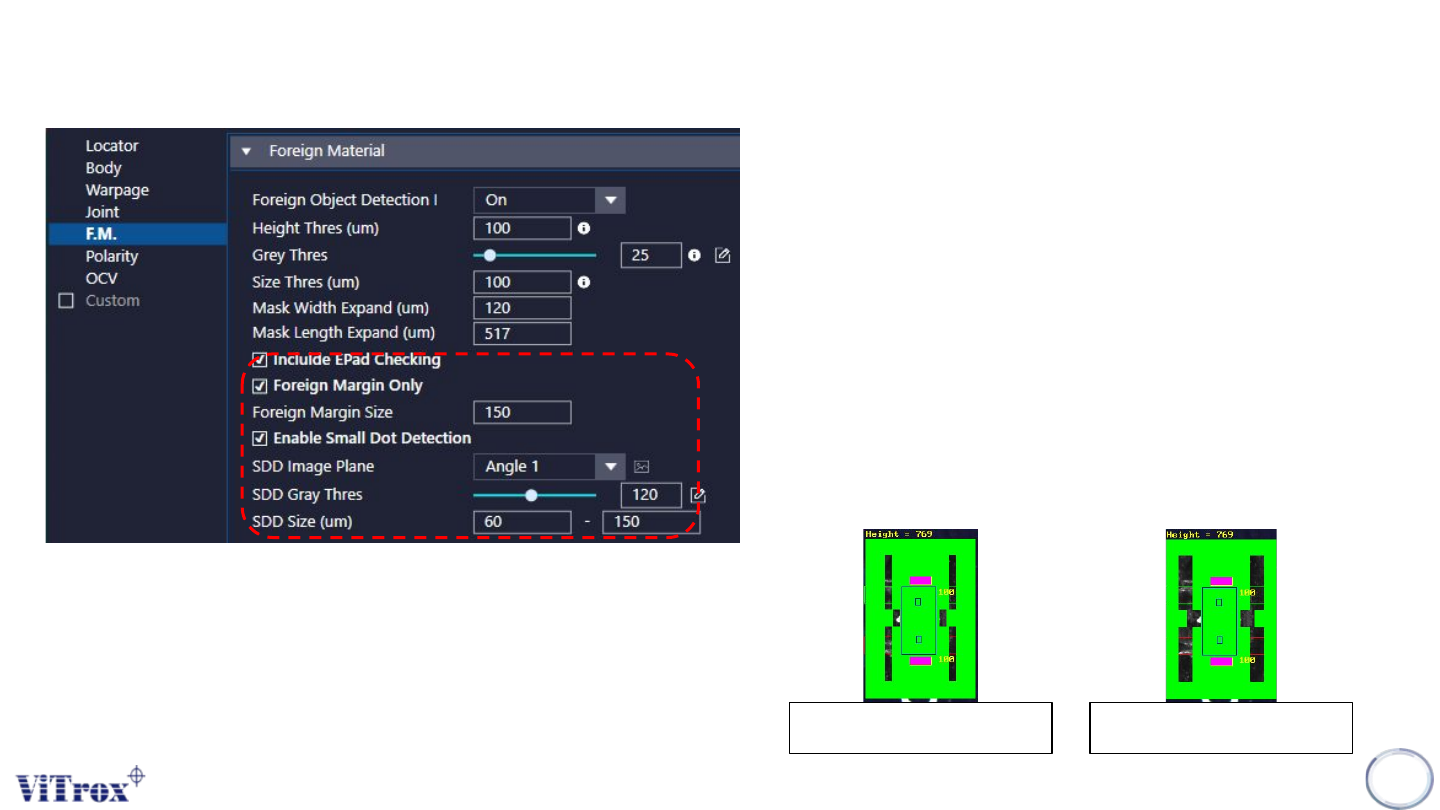 Copyright © ViT rox All Rights Reserved . 40 CR T ype Algorithm - Foreign Material 1. Foreign Object Detection ● 3 modes as follows: ● On & On (with mask Display) having the same inspection results. 2. Height Thres (…