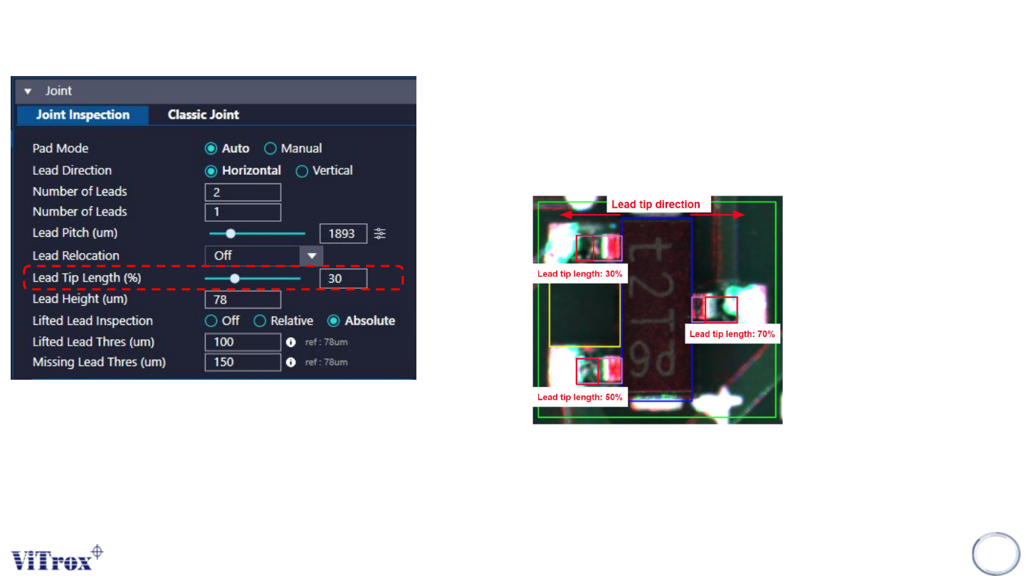 Copyright © ViT rox All Rights Reserved . 66 B-type Algorithm - Joint 7. Lead Height (um) ● T o pre set the height for the lead. ● Need to use this value during lifted lead inspection. 8. Lifted Lead Inspection ● Relativ…