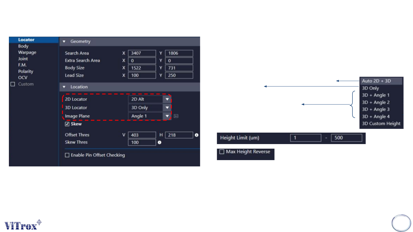 Copyright © ViT rox All Rights Reserved . CR T ype Algorithm - Locator 8 1. 2D Locator ● Only use 3D to locate the component location. ● Only use 2D to locate the component location. ● Select this to enable 2D + 3D Locat…