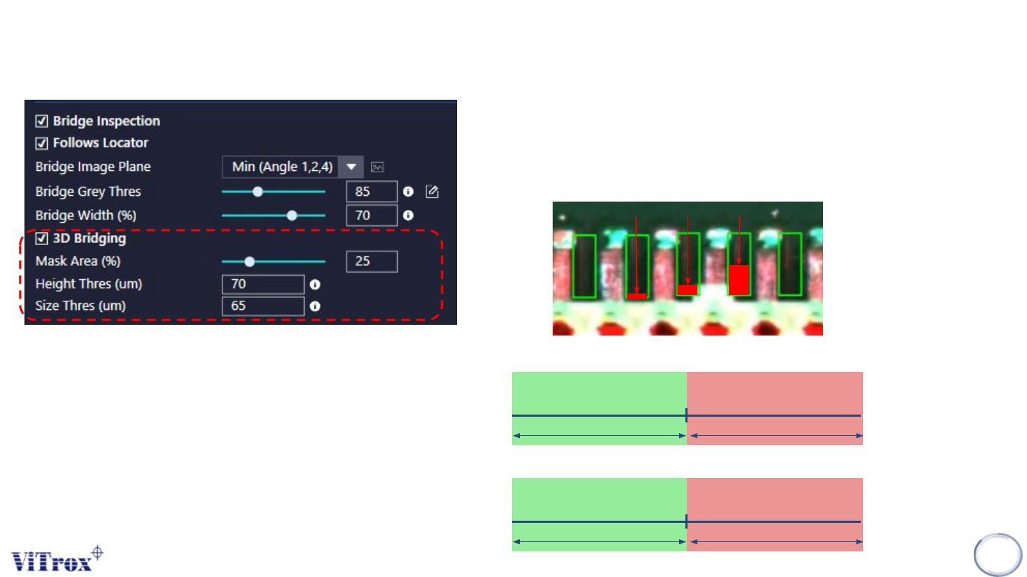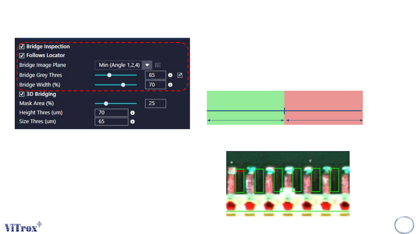 Copyright © ViT rox All Rights Reserved . B-type Algorithm - Joint (Bridging) 83 a. Bridge Mode 3D ● Enable or Disable 3D Bridge Inspection b. 3D Bridge Mask Area (%) ● T o adjust the size of Bridging Inspection boxes &a…