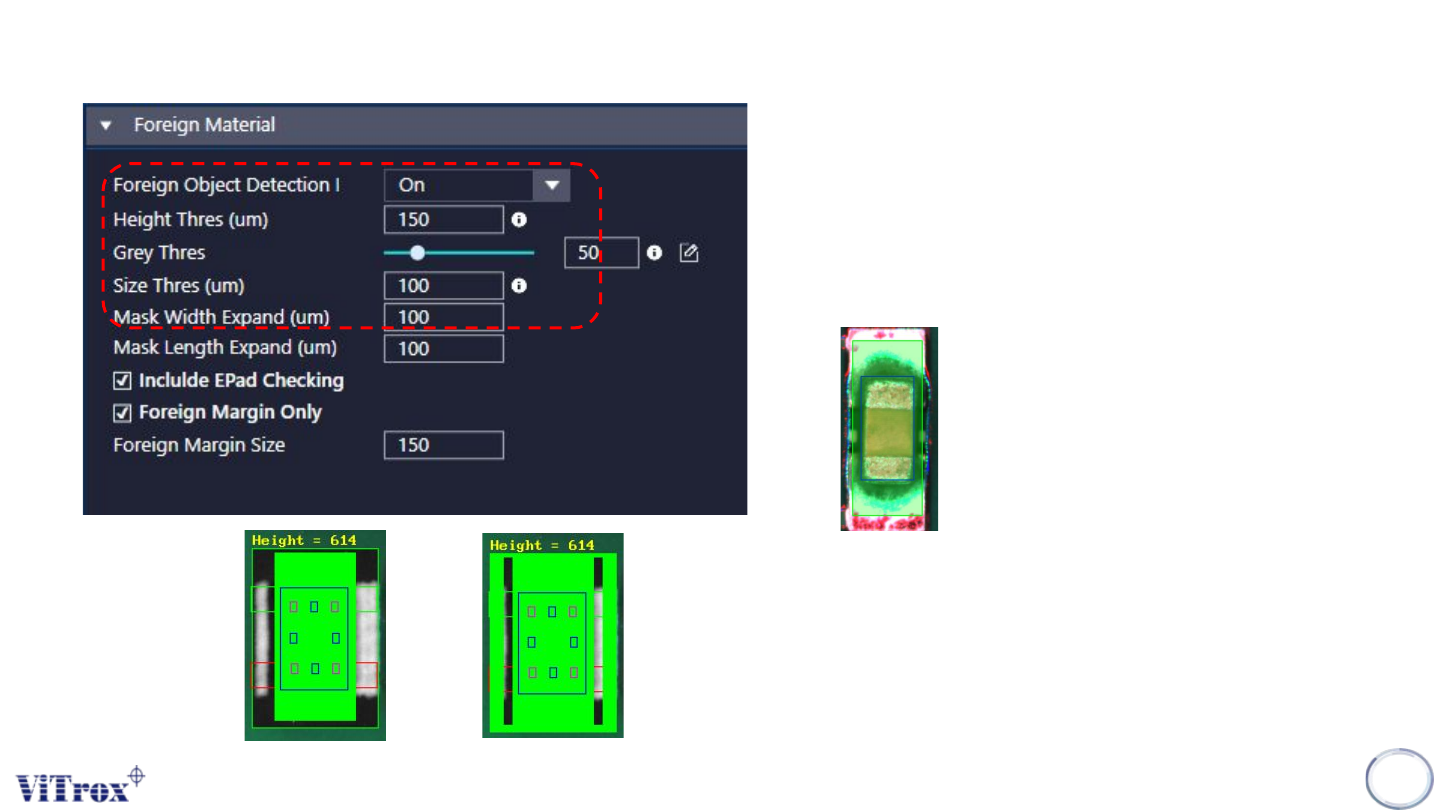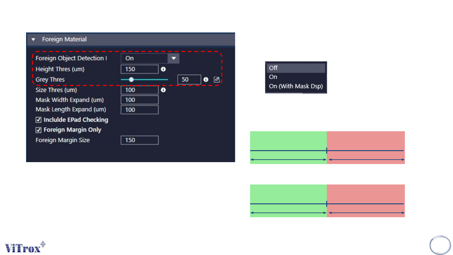 Copyright © ViT rox All Rights Reserved . 86 B-type Algorithm - Foreign Material 4. Size Thres (um) ● Minimum length and width to detect the foreign material. 5. Mask Width Expand (um) & Mask Length Expand (um) ● T o…
