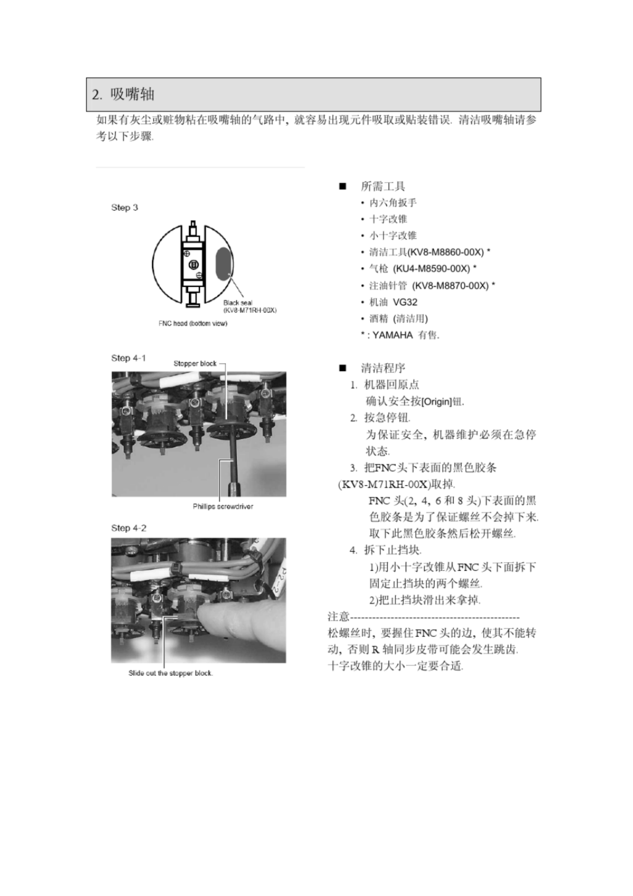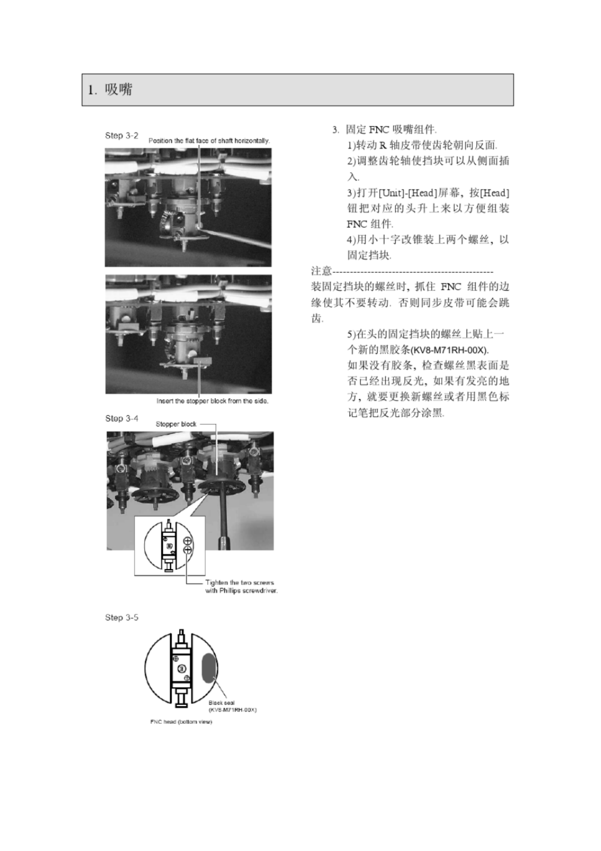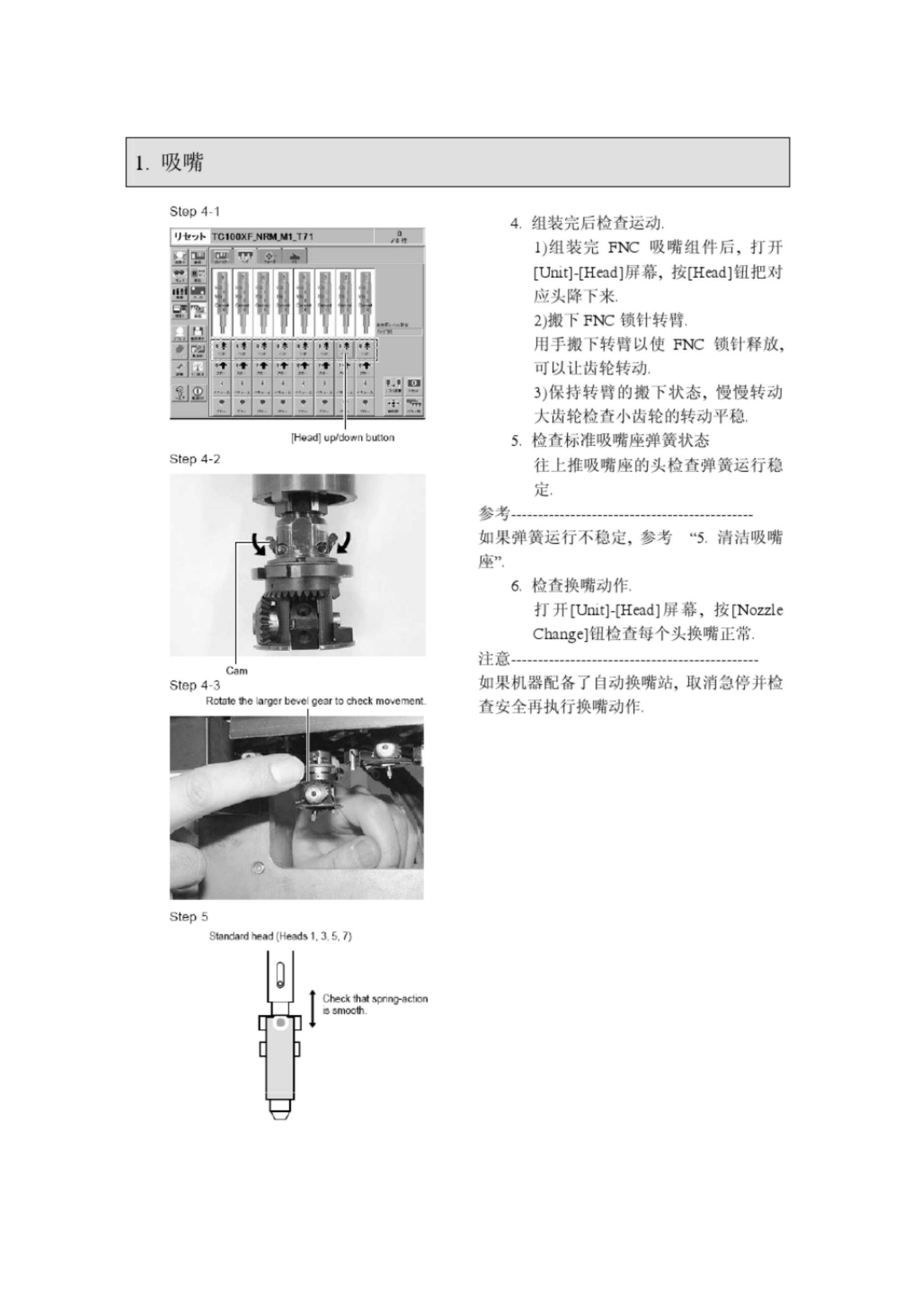 1 . 吸 嘴 step 4 - 1 4 ‘ 绀装完后检迕运动 , 组装完 FNC 吸嘴组件后 , 打开 [ UmtHKead ] 屏氣按 [ Kead 】 fil 把对 应头降 F 来 < 1 ) 搬 KFNC 锁针转肾 用手搬 F 转诗以使 FNC 锁针释放 , 可以让齿轮转动 . 3 J 保持转锊的搬卜状态 , 枵慢转动 人齿轮检査小 Mi 轮的转动 f 松 . 5 . 检 SW 准吸嘴座弹筲状态 往上推吸嗬座的尖检 0 狎…