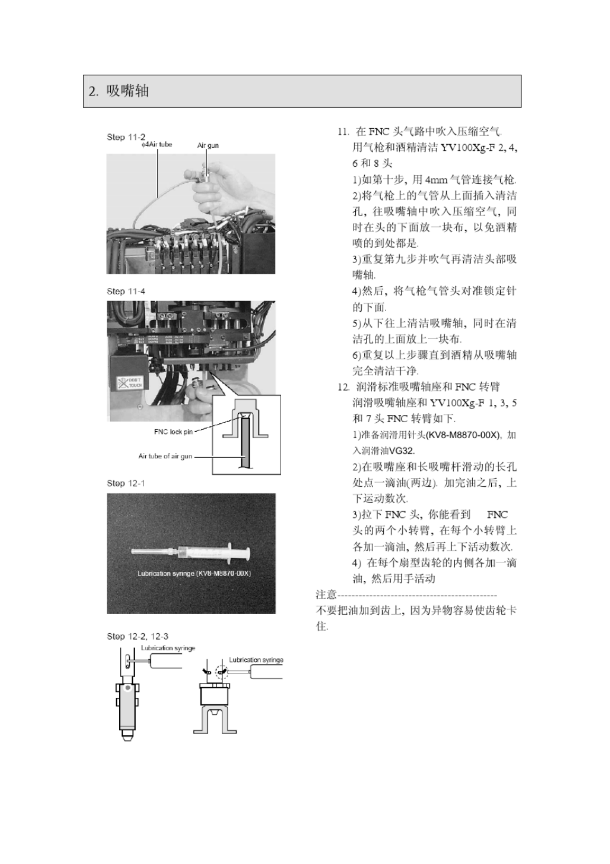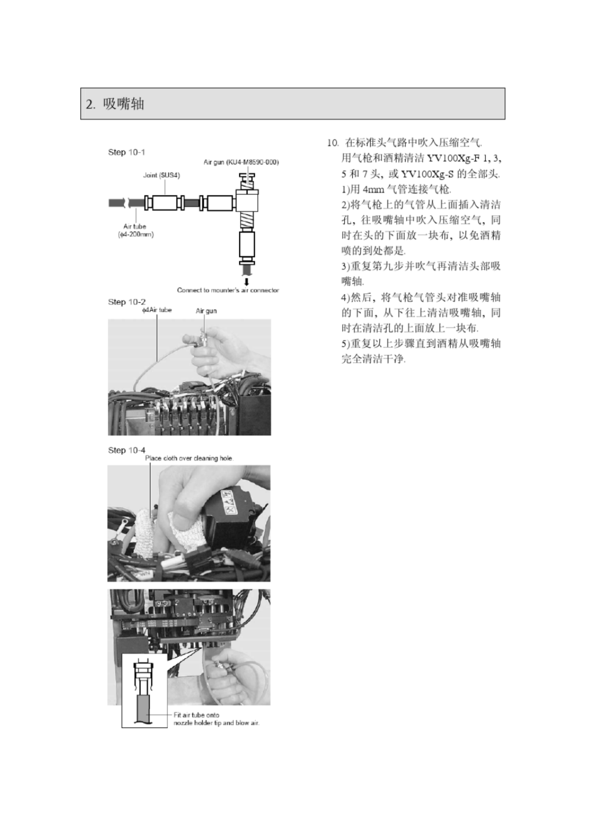 2 . 吸嘴轴 io . 在标准头气路屮吹入压缩空气 , 用 n 枪和酒精滴沽 YVi 00 Xg - : P 1 , 3 , 5 和 7 头 , 或 YV 100 Xg - S 的全部头 . 1 ) 用 4 mm 气管连接气枪 , 2 J 将气枪上的气管从上面插入淸洁 孔 , 往吸嘴轴中吹入压缩空气 , 同 时在头的 K 面放一块布 , 以免洒精 喷的到处都是 . 重复第九步并吹气再淸洁头部吸 S I 嘴轴 . 4 ) 然后 , 将气…