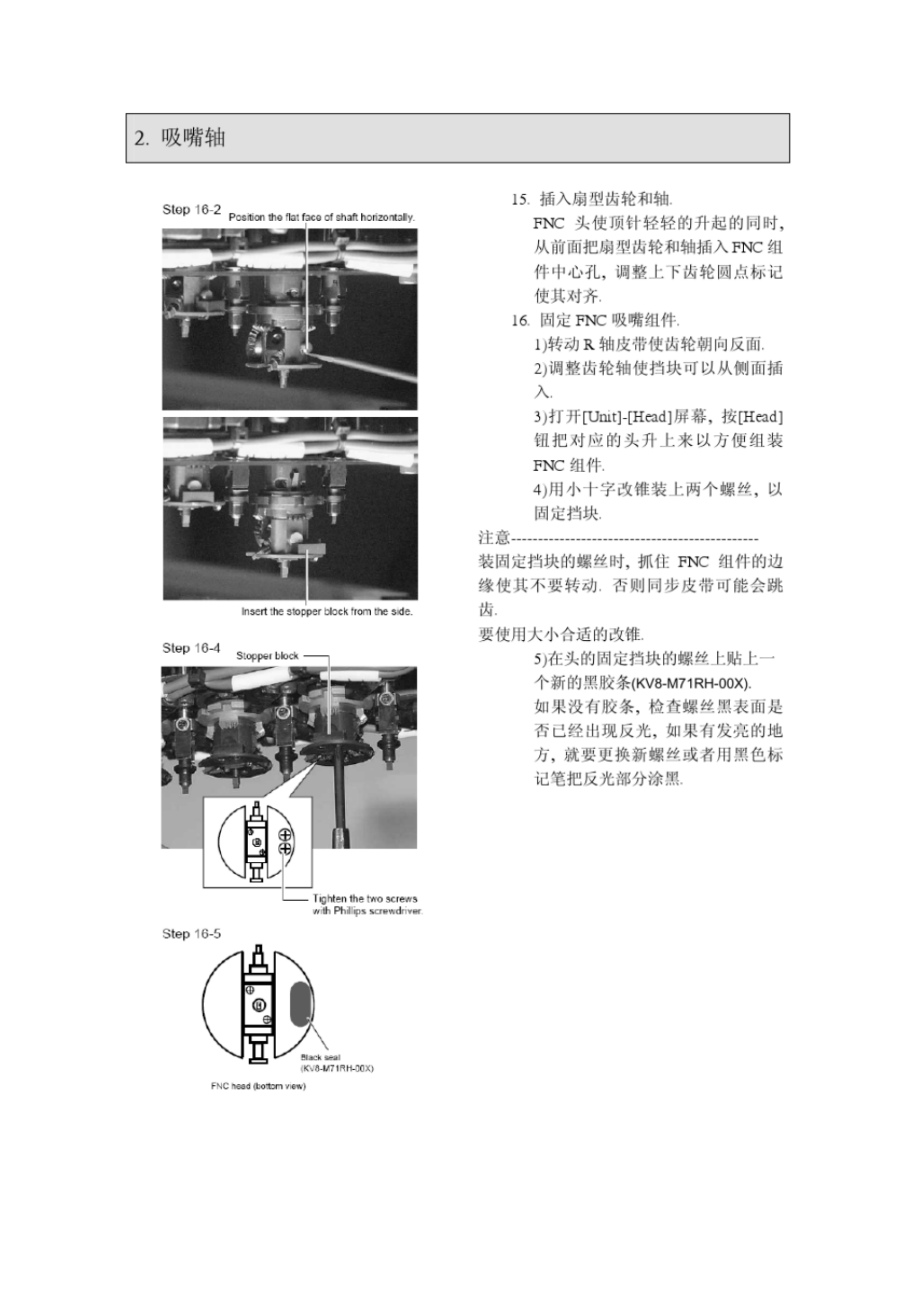 2 . 吸 嘴 轴 13 装冋淸洁孔的螓 it 用 M 5 六角扳手把 3 个清洁孔的螺 丝装上 14 重装 FNC 吸嘴纽件 10 . [ Umr ] - [ Head ] 屮按 [ Head ] 纽把付 应的头降卜来 . 转动 R 轴皮带使 FNC 组件荇姑安 装 , 让齿轮上中心小圆点标记朝前 . 3 ) 手持 FNC 汛件让 72 吸嘴朝 K , 插 到 FNC 头上 ft 到感觉顶针辁轻的升 Step 1 小 1 < j…