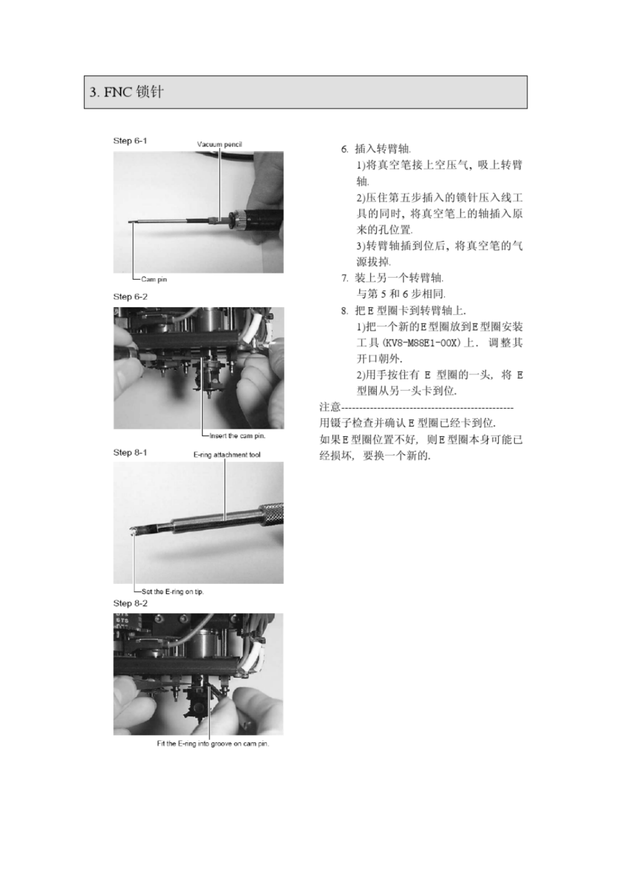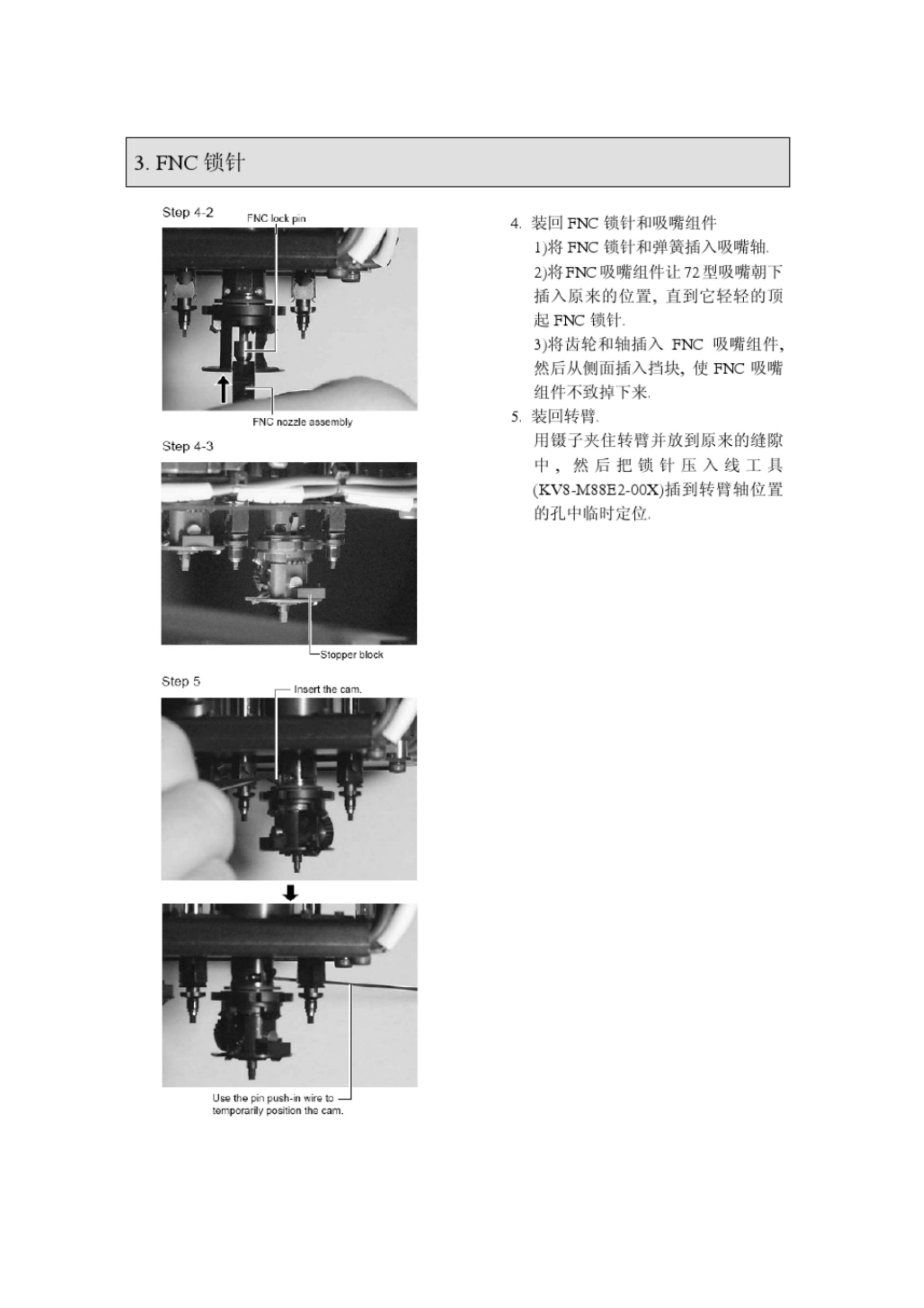 3 . FNC 锁针 Step 4 - 2 嶋却 4 - 装回 FNC 锒针和吸嘴绀件 1 J 将 FNC 馈针和弹簧插入吸嗬轴 . 4 将 FNC 吸嘴纽件让 72 型吸嗬朝卜 插入原来的位置 , n 到它转轳的顶 起 PNC 锁针 . ~ 将出轮和轴柚入 FNC 吸嘴组件 , 然后从侧丽插入档块 , 使 ¥ ^ C 吸嘴 绀件不致掉下来 . 5 . 装回转背 . 用镊 7 夹住转贷几放到原米的缝隙 屮 , 然 后 把 锁 针 压 入…