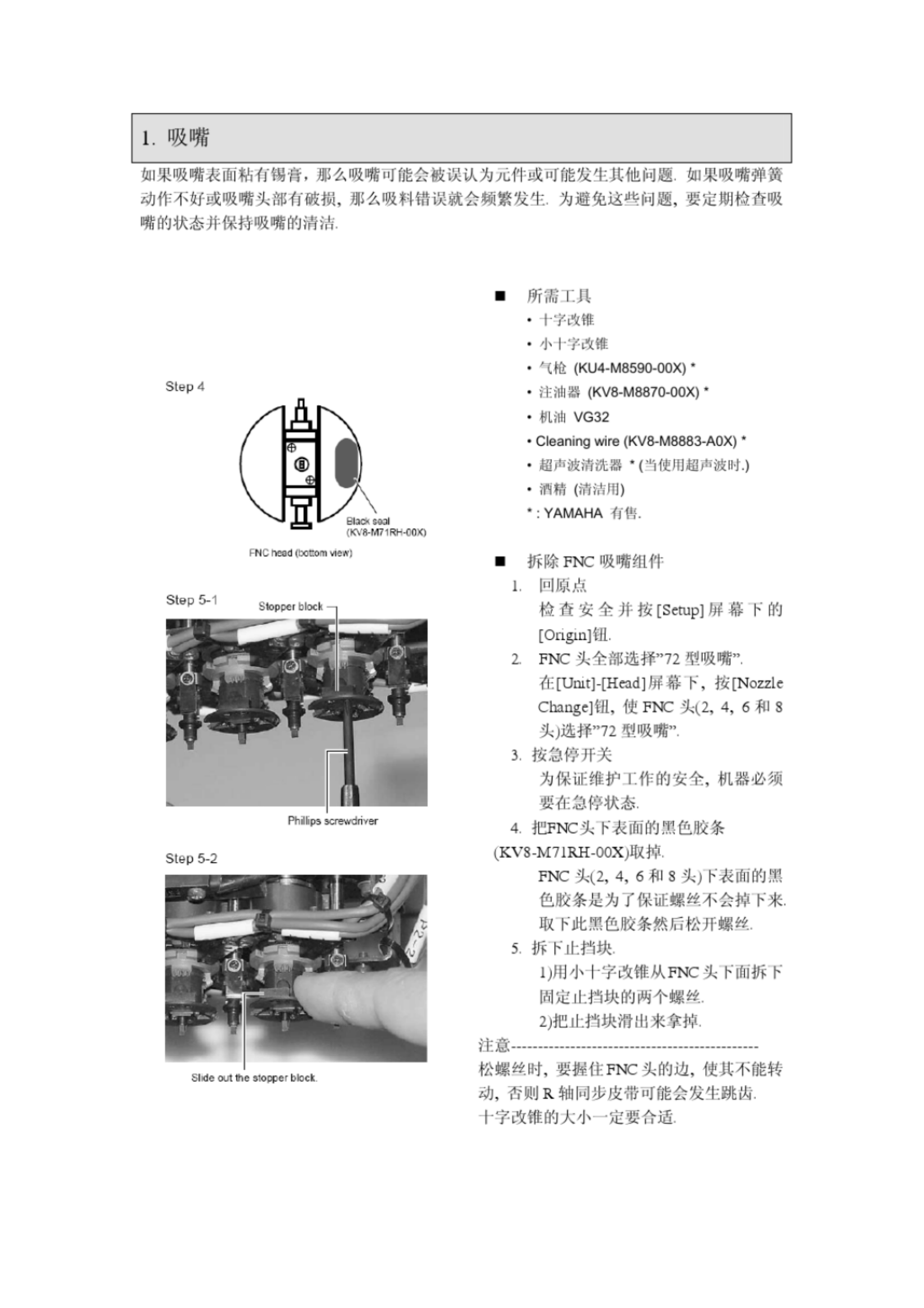 第 一 节 头 部 ( YVlOOXg ) 介绍 第一节解释 / YAMAHA WiOOXS - F 和 YV 100 Xg - S 系列贴装机头部部件的柃饩和消洁 ® 序 。 ■ 随机备件 以卜足随机备件 , 史换备件时 , 一定要使用 YAMAEA 原装的备钟 , 如果必须要使坩原 装以外的备件成使用特定的工玷与我们的销也部门或代理商联系 。 [ 1 ] 卡吸嘴的簧片 [ 2 ] 蝶型簧片 [ 3 ] 簧片固定螺玲 [ 4 ] 挡块…