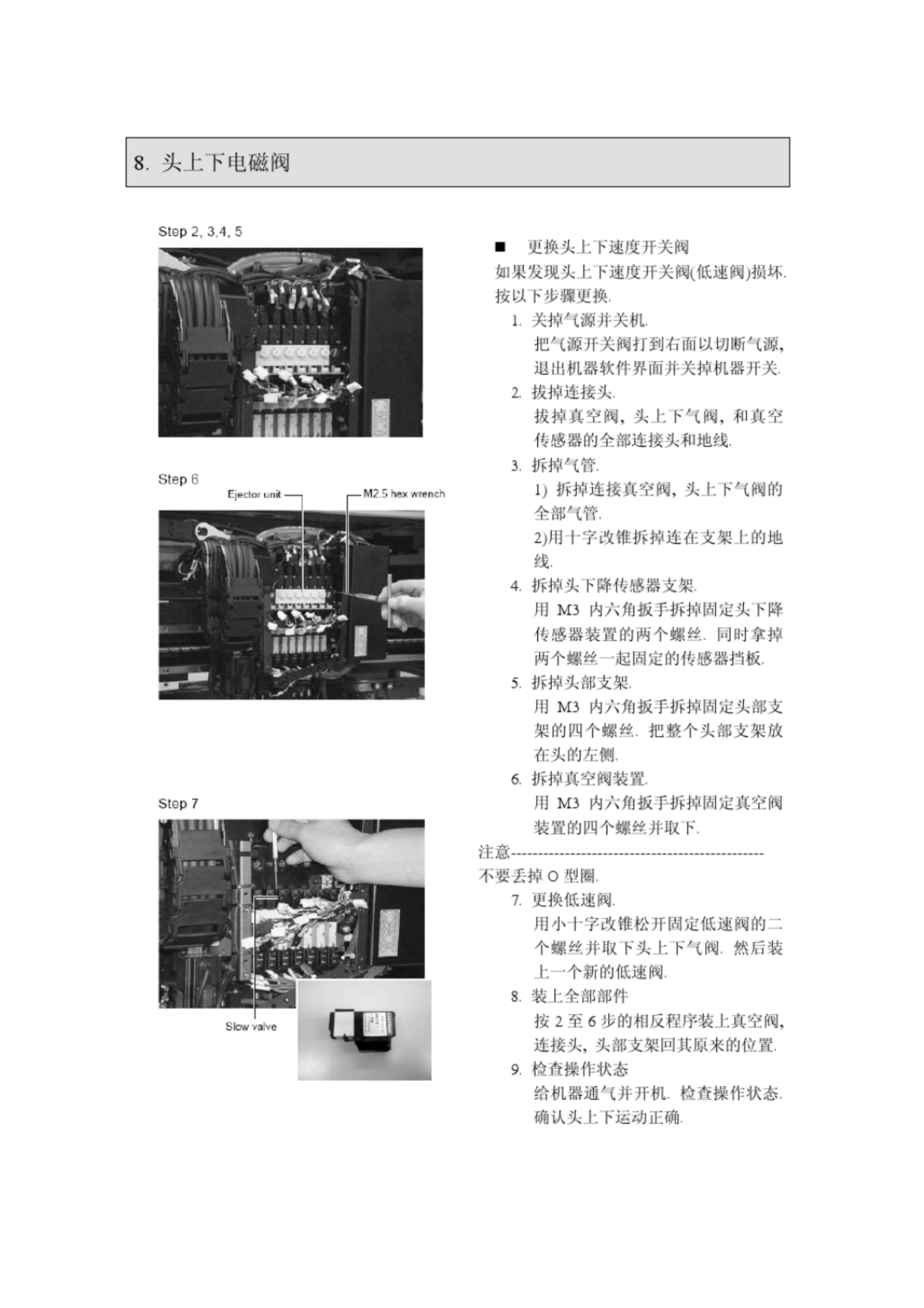 8 . 头上下电磁阀 Stop 2 , 3 , 4 , 5 ■ 史换头上 K 速度开关阀 如采发现头上卜速度开关阀 ( 低迚阀 ) 损坏 . 按以卜步骤史换 , I . 关掉气源并关机 , 把气源开关阀打到右而以 《 断 / ( 跺 , m 山机器软忭界而并关掉机器幵关 . z 拔掉连接头 , 拔掉真空阀 , 头上 KH 阀 , 和真空 传感器的全部连接头和地线 . 3 . 拆掉气管 . 1 ; 拆掉连接茛 9 阀 , 头上 hv C …