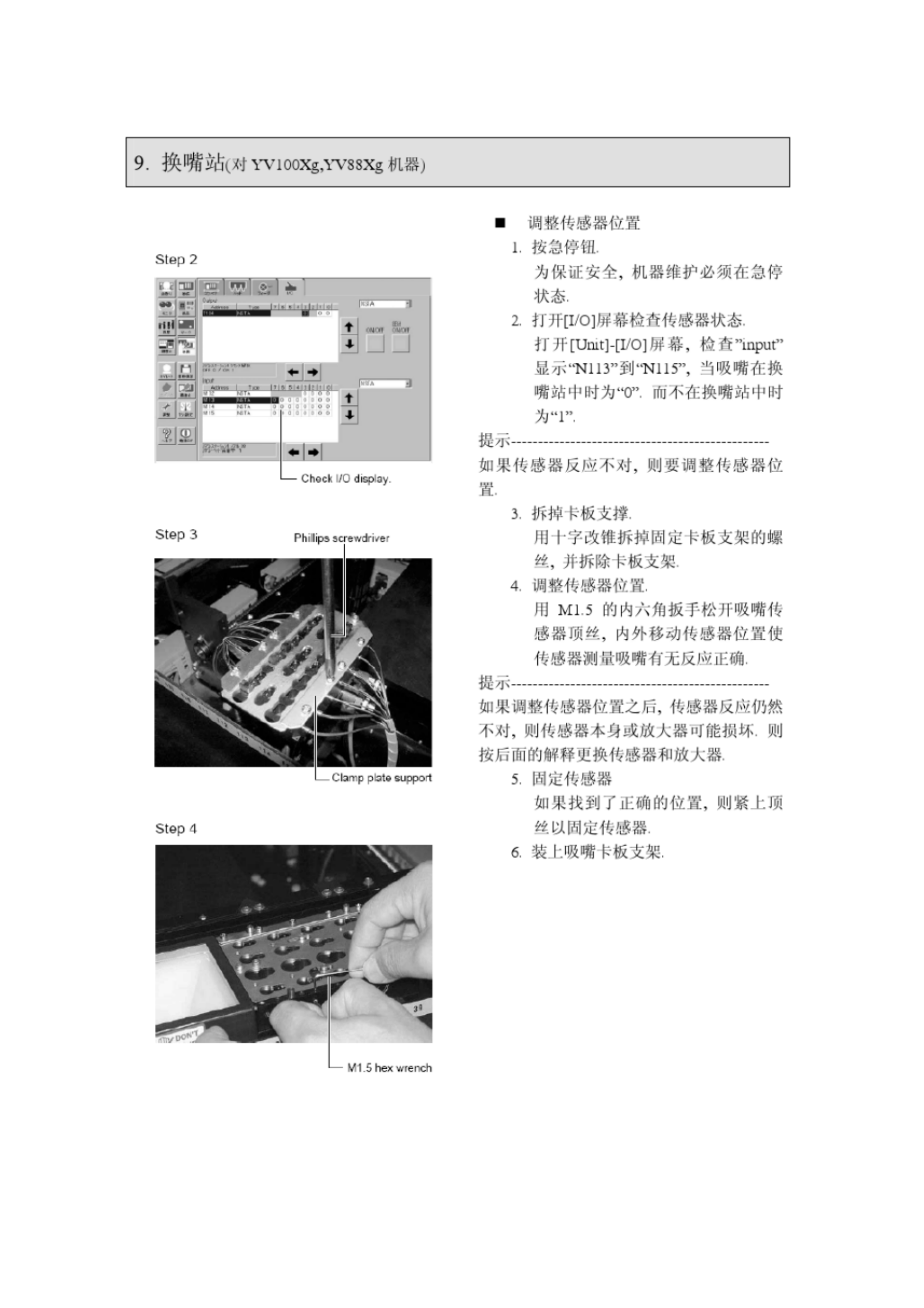 9 . 换嘴站 C 对 WlOOXg . YVSSXg 机器 J 灰尘在换嘴站中的埔积 , 吸嘴传感器故陣或传感器放人器调衲不好可能牙致吸嘴检测错误 , 耍定期清洁换嘴站 . ■ 清洁吸嘴站 L 技急停钮 . 为保证安全 , 机器维护必须在急停 状态 ■ Step 2 kJ 埜 — ITO display should road rl ' h 2 . 打开吸嘴 P 板 . 1 J 打开 [ UoitHI / O 】 屏蒂 . …