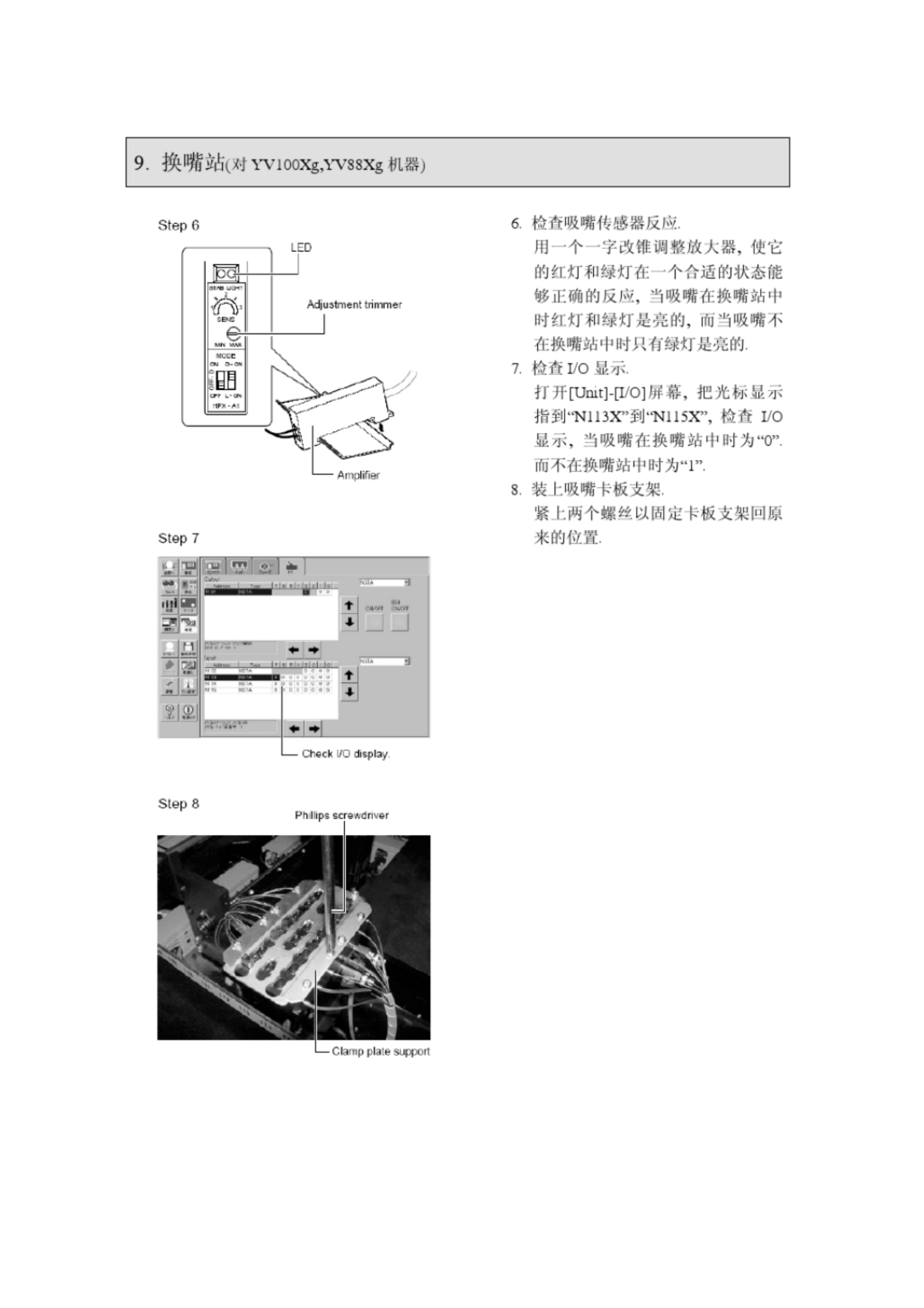 9 . 换嘴站 C 对 WlOOXg . YVSSXg 机器 J 6 检查吸嘴传感器反 7 屯 用一个一字改锥凋整放人器 , 使它 的红灯和绿灯在一个 rv 适的状态能 够正确的反应 , 畀吸嘴在换嘴站中 时红灯和绿灯足亮的 , 而当吸嘴 + 在换嗬站屮时 A 4 绿灯是亮的 . 7 . 检査 I / O 显示 . 打开 [ Umt ] - p / 0 ] 屏 # , 把光 fc ® 示 指 到 检 査 I / O M 示 , 当吸嘴在…