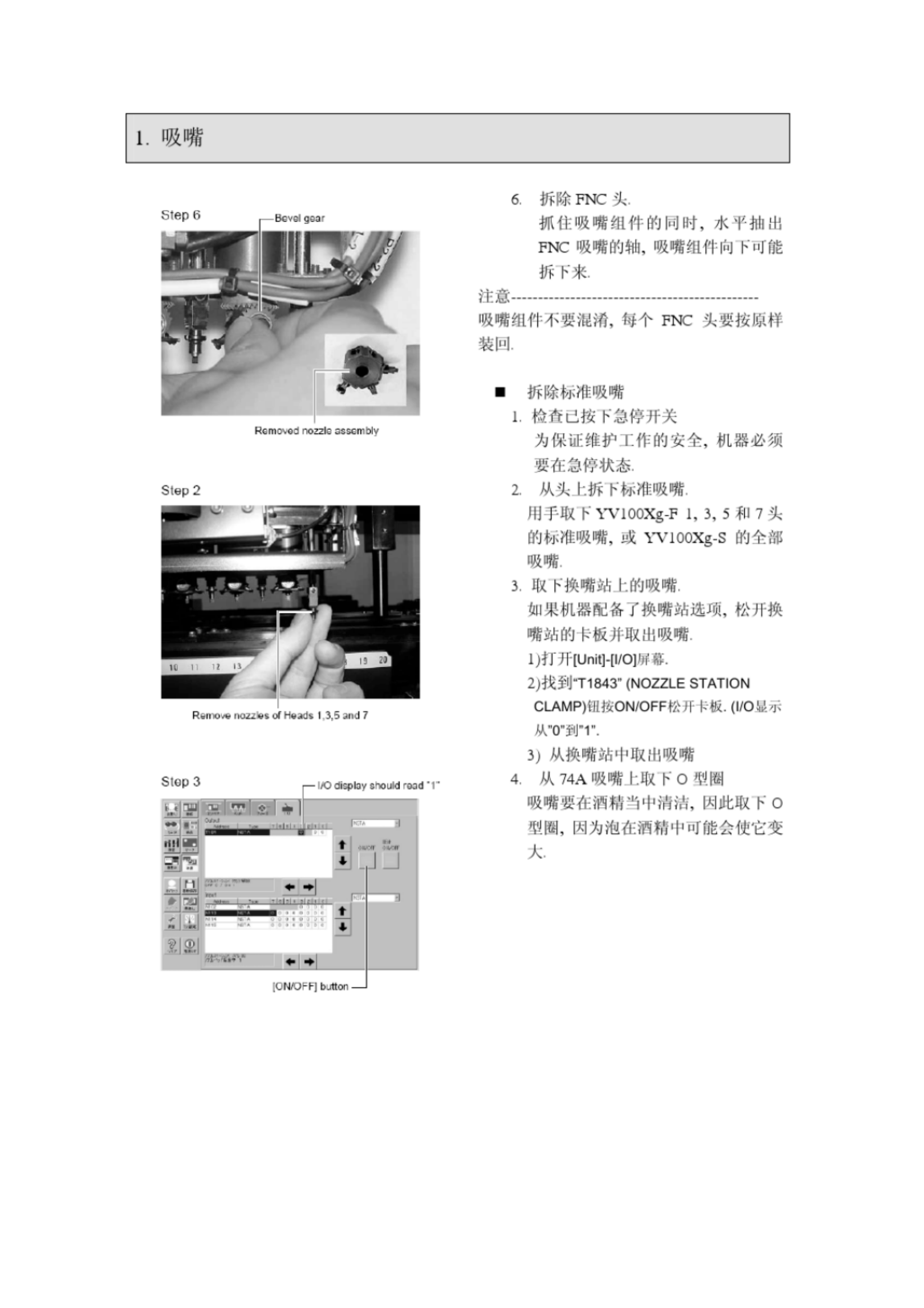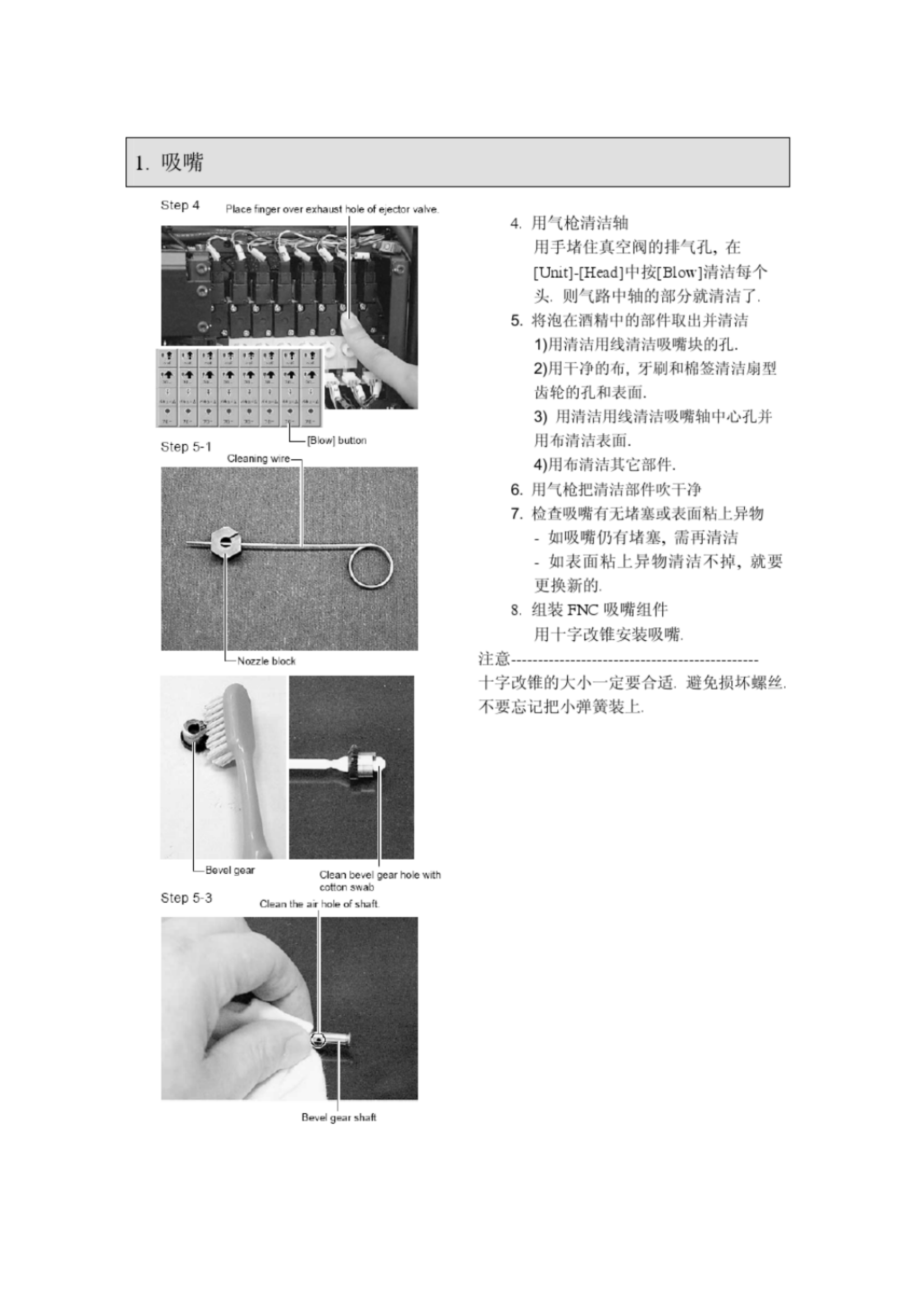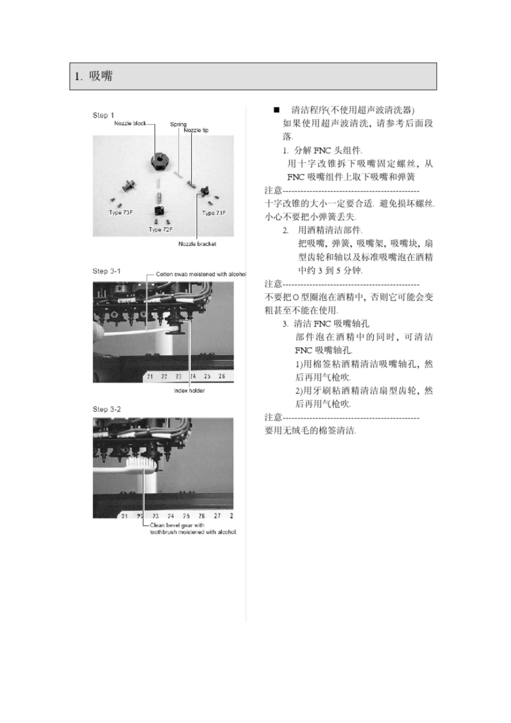 1 , 吸 嘴 ■ 淸洁程序 〔 不使用超卢波淸洗器 J 如果便用超卢波清洗 , 请参考后面段 Step 1 Spnn Nozzle tip 落 ■ i . 分解 FNC 头组件 . 用十字改锥拆卜吸嗬闹定嫘绰 , 从 FNC 吸嘴组件上取卜吸嘴和弹簧 # 注意 y 十字改 m 的大小一定耍介适 . 避免损坏螺坟 . 小心不要把小弹黃丢失 , I 用酒精淸洁部件 . 把吸嘴 , 弹簧 , 吸嘴架 , 吸嘴块 , 扇 型 & 轮和…